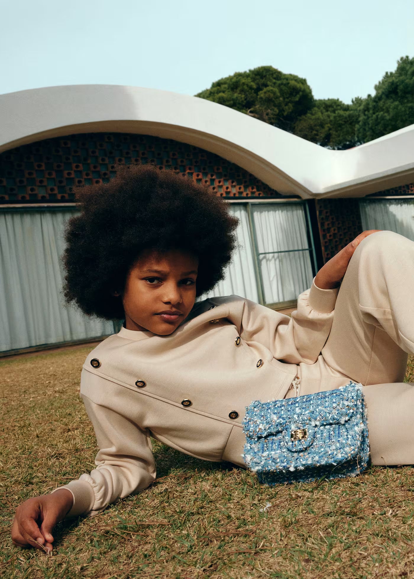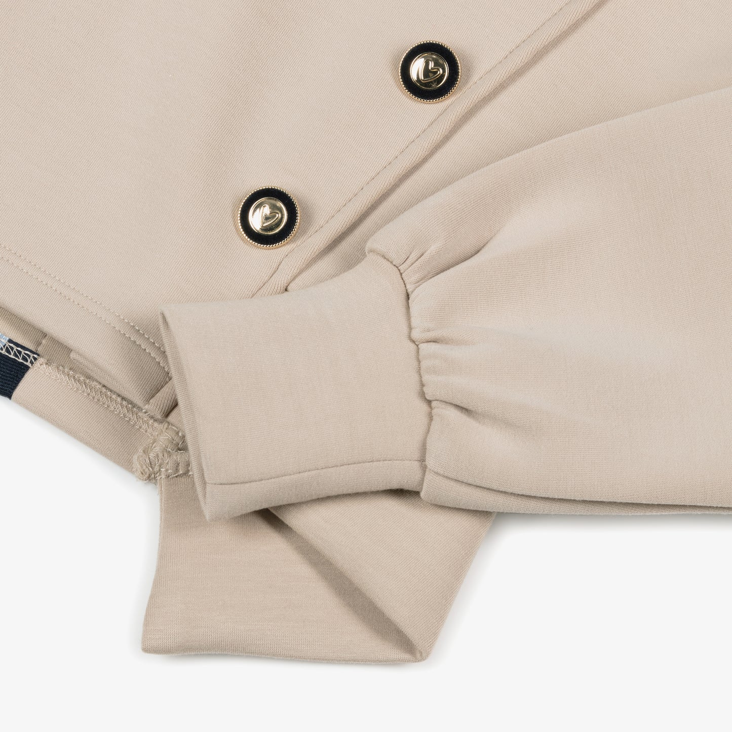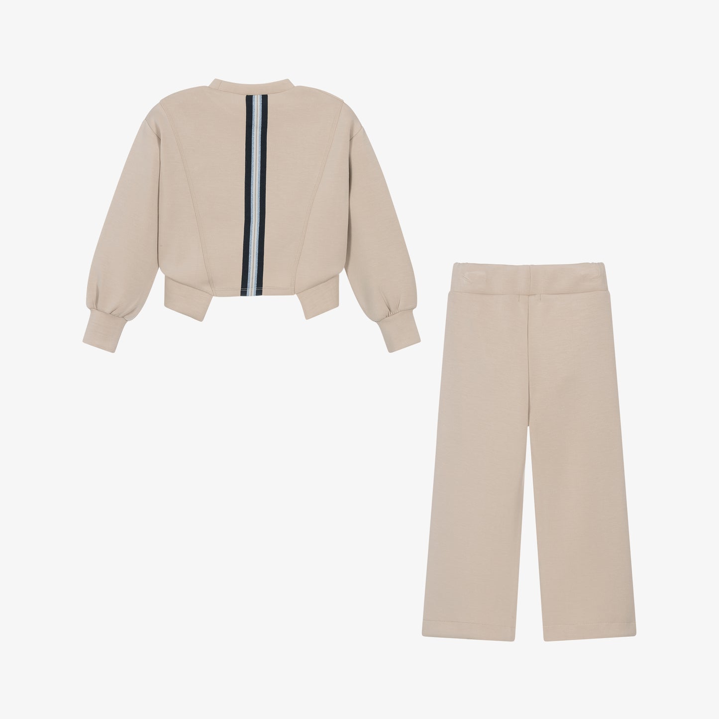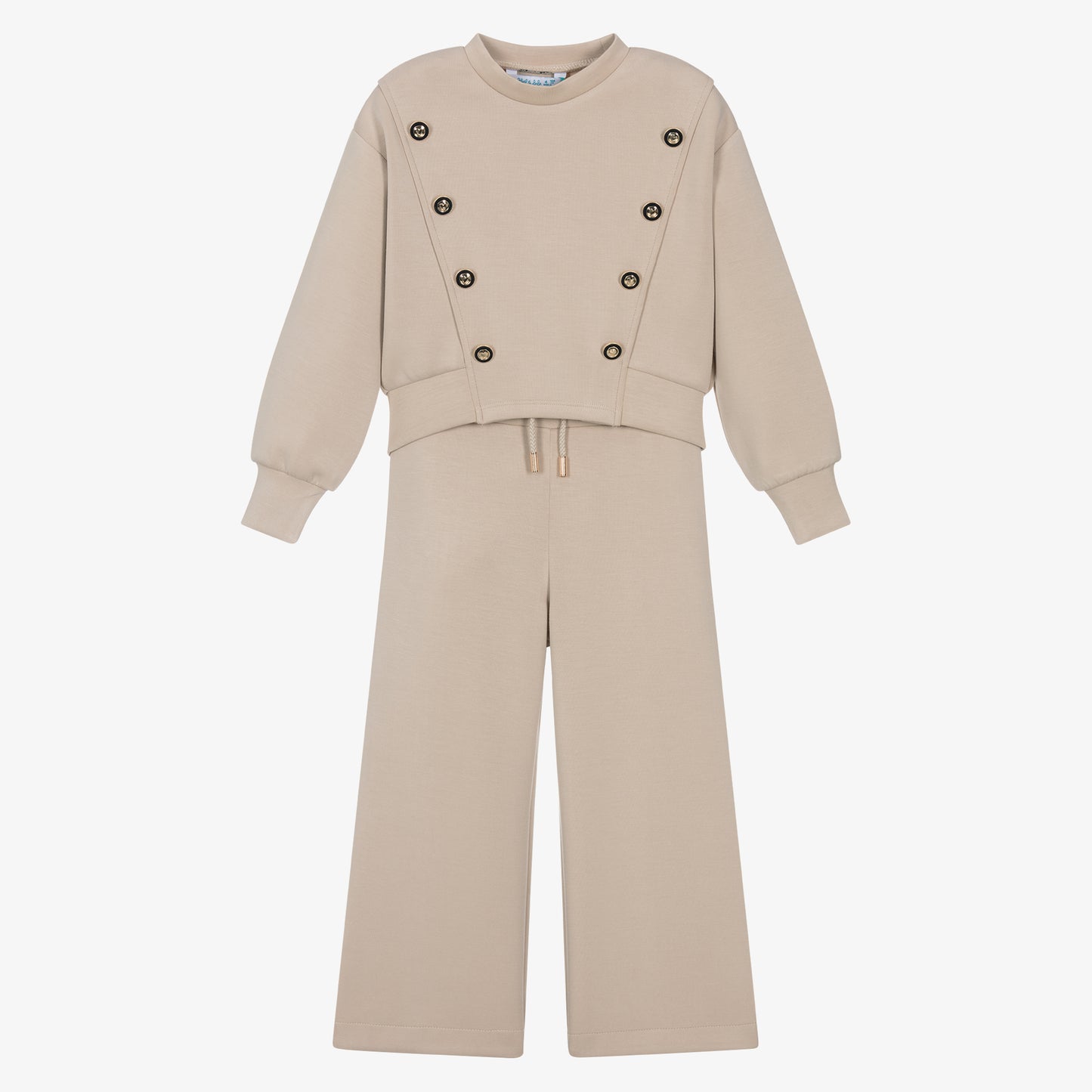 Um elegante conjunto de calças e camisola bege para menina da Abel & Lula, produzidos em jersey macio e suave com dupla face. A camisola tem elegantes botões pretos e dourados na frente e um acabamento em gorgorão contrastante nas costas. As calças largas têm um cós elástico confortável, um cordão decorativo e detalhes dourados brilhantes.