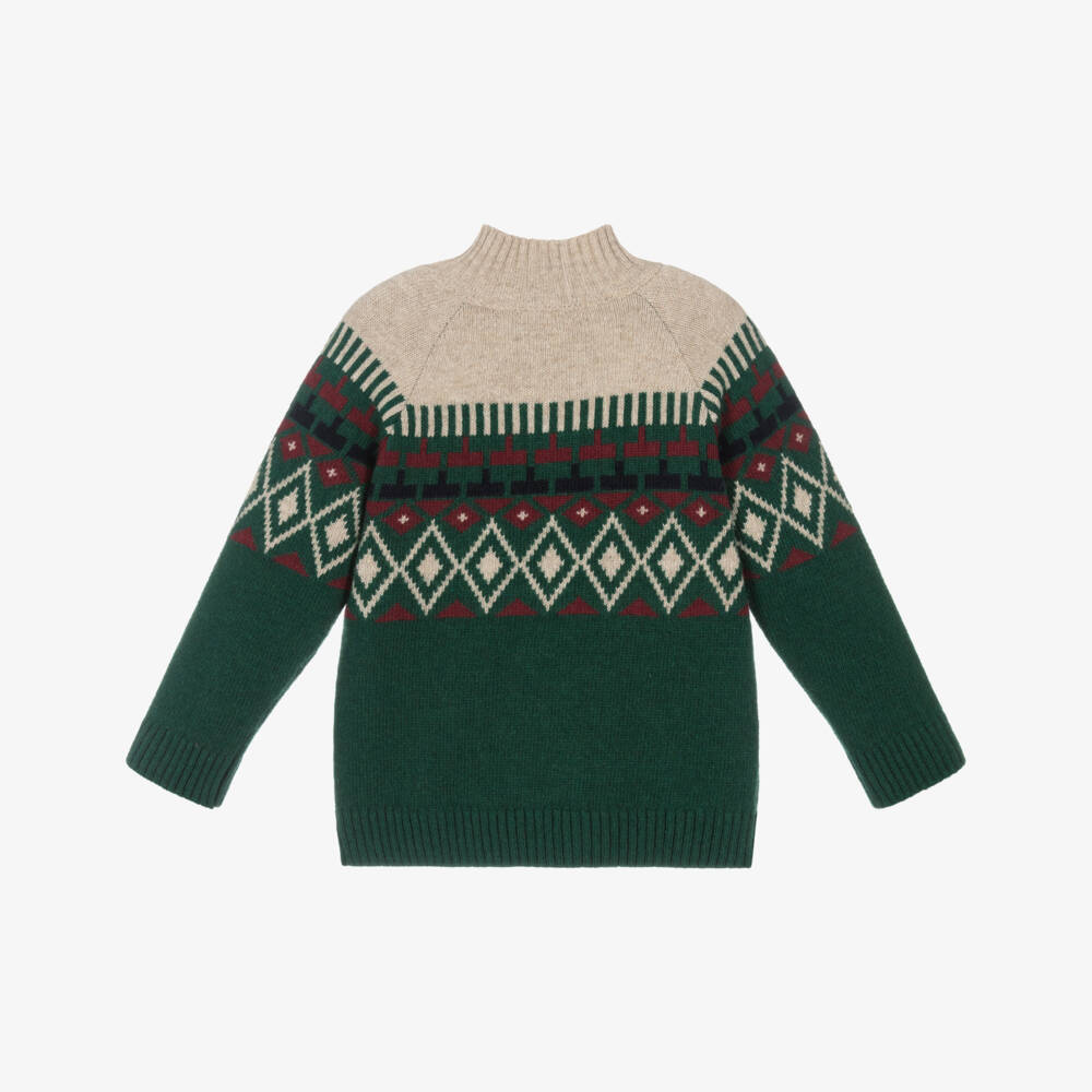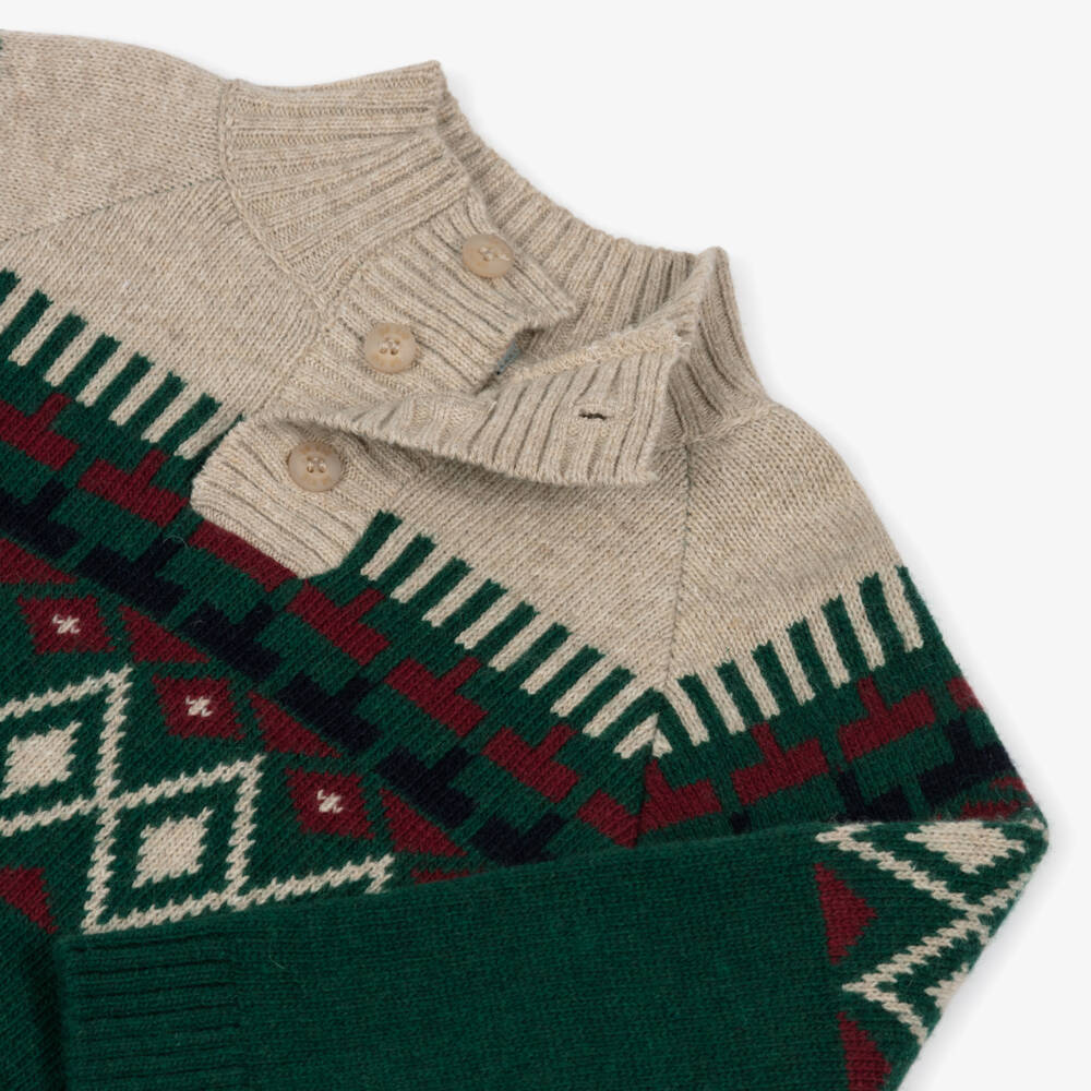 Camisola malha menino da marca portuguesa Dr.Kid. Tricotada numa mistura de lã e algodão, com um toque macio e quentinha. Tem o clássico padrão Fair Isle em azul marinho, bordeaux e bege. A gola é canelada e aperta com botões.