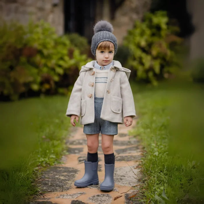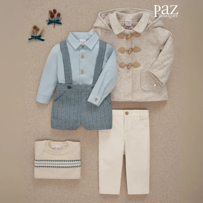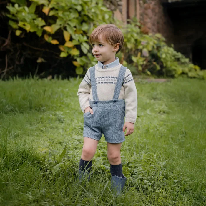 Camisola bege da marca espanhola Paz Rodríguez. Tricotada numa suave mistura de algodão e caxemira, com um padrão geométrico azul e branco no peito e um toque macio e aconchegante.