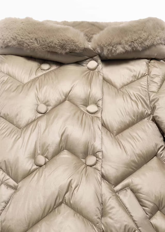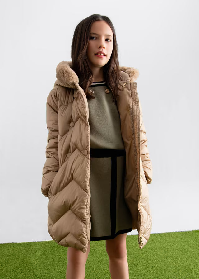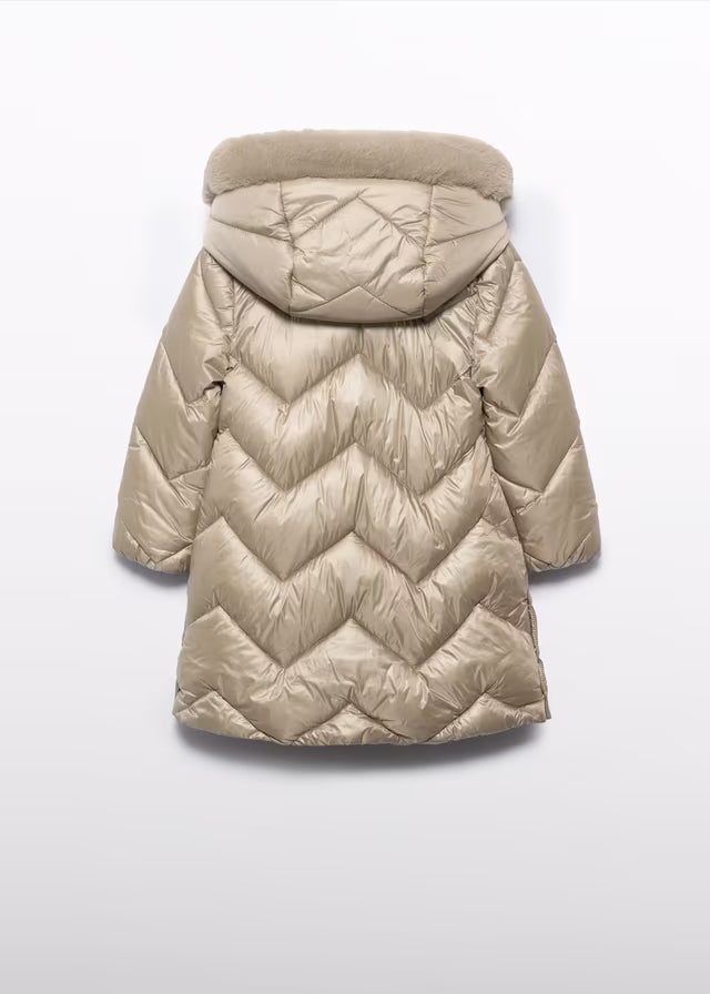 Casaco bege para meninas da Abel & Lula com um design em zigue-zague. Produzido em tecido macio, este casaco longo apresenta um acabamento em pelo sintético no capuz fixo. Bolsos frontais e fechos de pressão nas laterais para facilitar os movimentos. Este casaco quentinho fecha com zíper invisível e botões de pressão, e tem um elegante estilo trespassado com botões falsos.