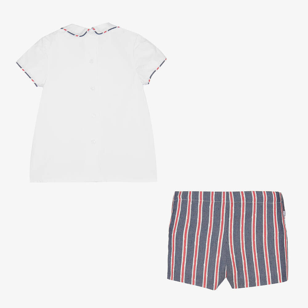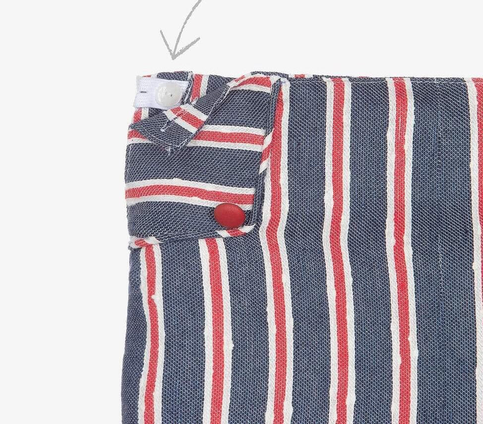 Conjunto de calção e camisa para meninos mais novos da Foque. A camisa branca de algodão tem detalhes de prega na frente com debrum que combina com o calção. Aperta nas costas com botões para vestir facilmente. O calção de sarja azul marinho com riscas em vermelho e cru, totalmente forrados. Apertam com botões nas laterais e tem elástico de ajuste no interior da cinta. Um look lindo e confortável para os dias mais quente.