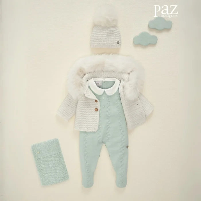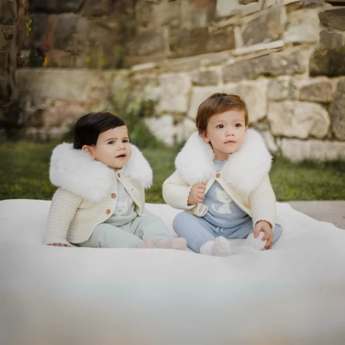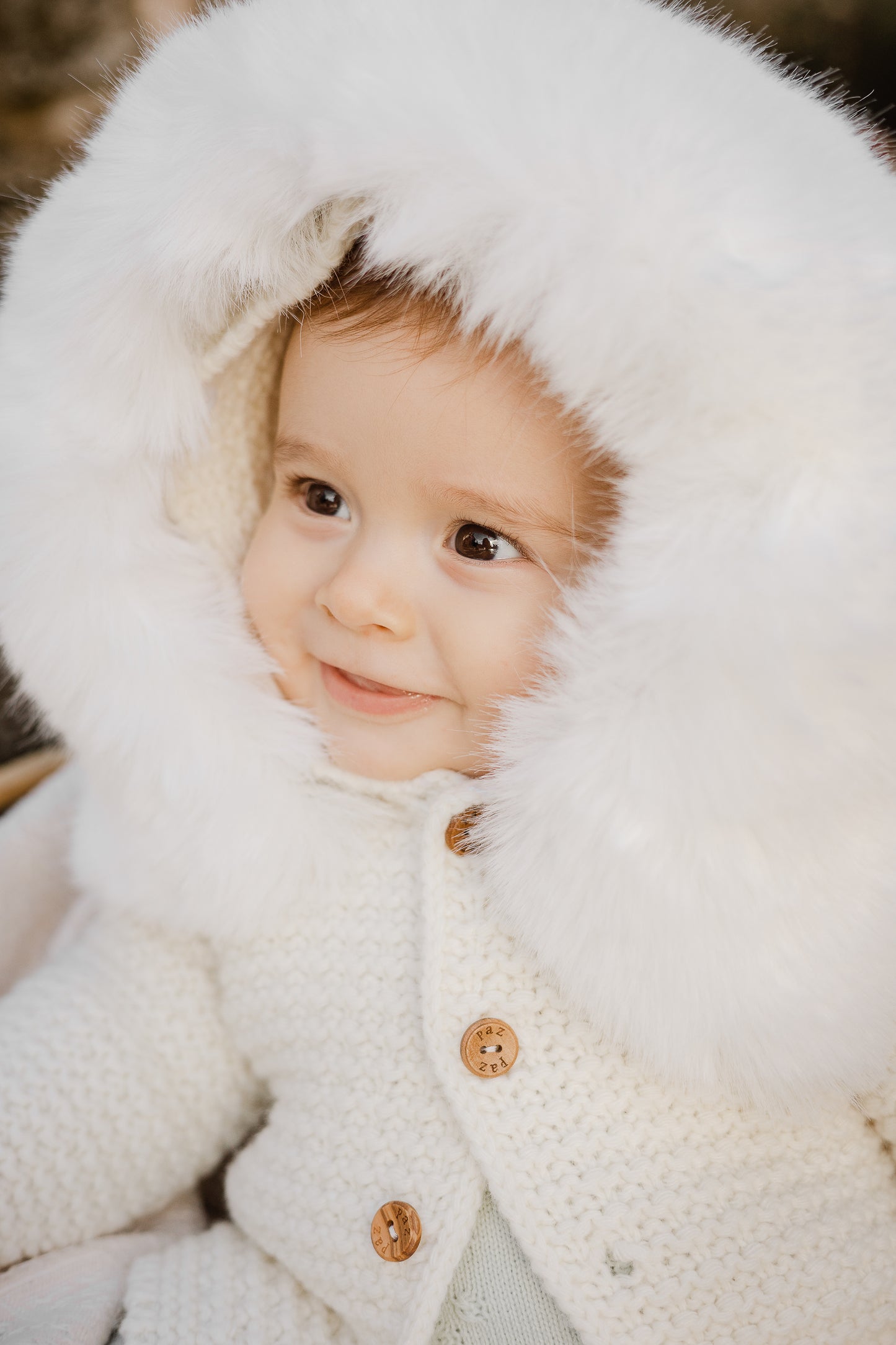 Casaco de malha grossa em tom cru para meninas e meninos da Paz Rodriguez. Produzido numa suave mistura de lã. Aconchegante e clássico, aperta à frente com botões de madeira. Acabamento de pelo sintético removível que se prende ao capuz com botões. Um logotipo prateado é apresentado na bainha.