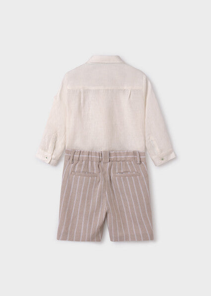 Conjunto de calções, camisa e laço para menino da Abel e Lula. Produzido num linho macio, a camisa com colarinho com abas ,aperta com botões na frente. As mangas compridas podem ser dobradas e prendem com presilhas para um look mais casual. Calção bege com riscas finas em tom pérola .Totalmente forrados , apertam com botão na frente. Elástico na parte de trás da cintura para maior conforto. Laço no tom do calção com elástico que fixa no botão.