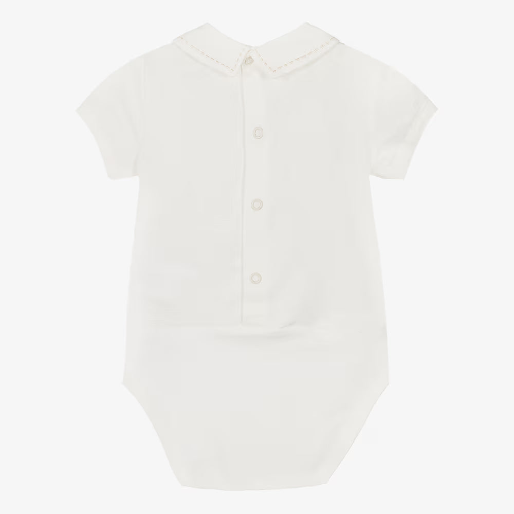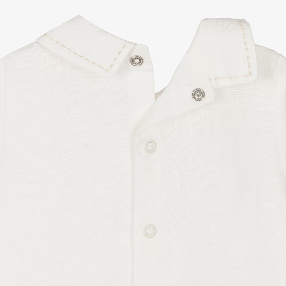 Lindo e elegante body de linho e algodão para bebés da marca portuguesa Dr. Kid. Em tom crú com pesponto bege na gola e peito. Aperta nas costas e entre pernas com molas de pressão.