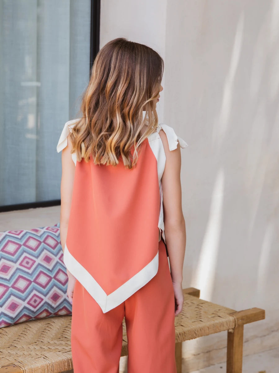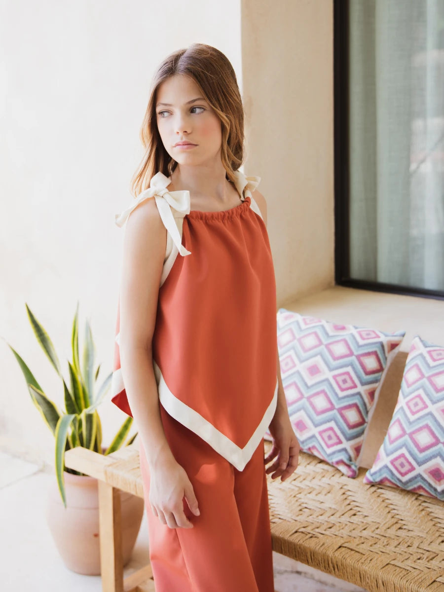 Conjunto de menina da marca espanhola Eve Children, formado por uma túnica e uma calça flare. Em tom telha com detalhes em cru, é um conjunto muito prático e bonito. A túnica aperta no ombro com dois laços e a calça tem cintura elástica para total conforto e aperta de lado com fecho invisível.