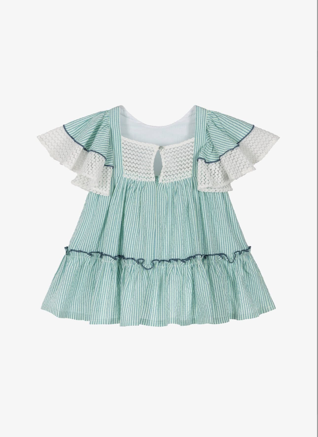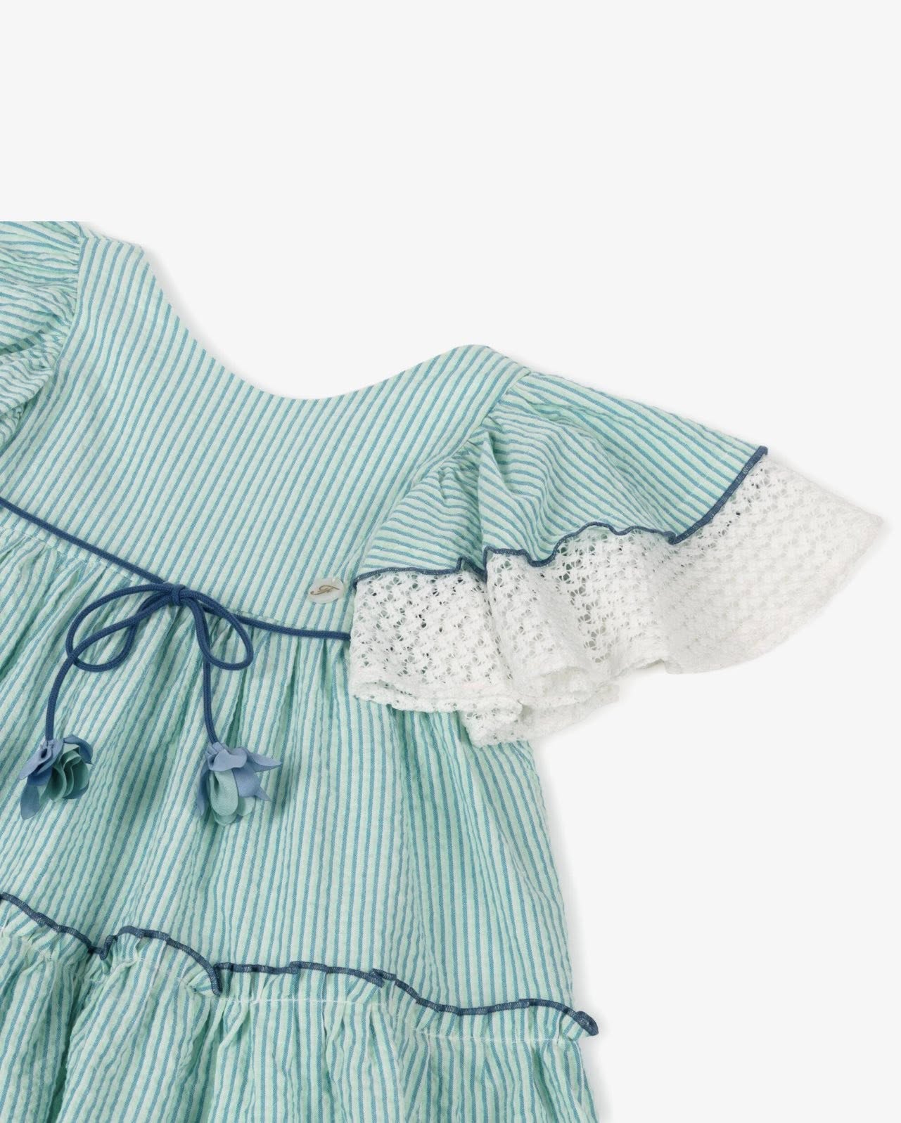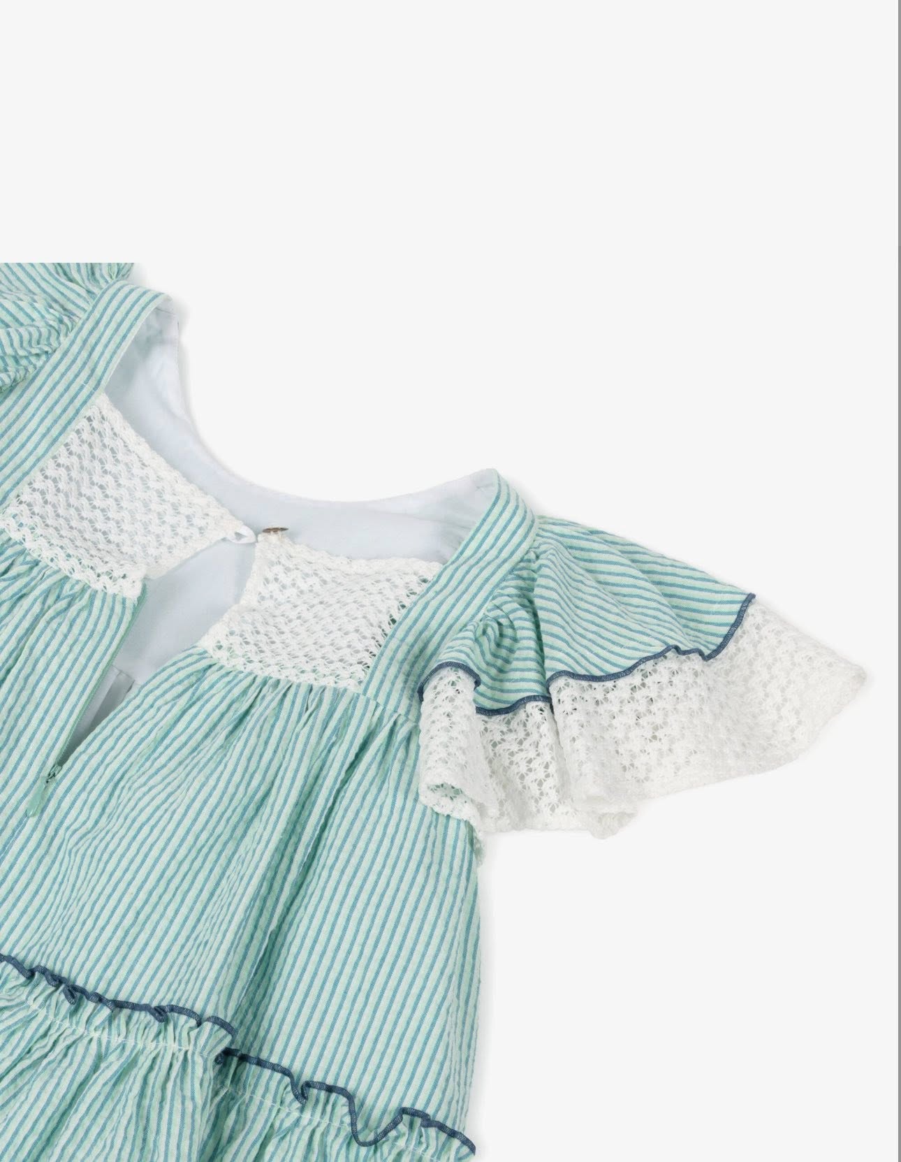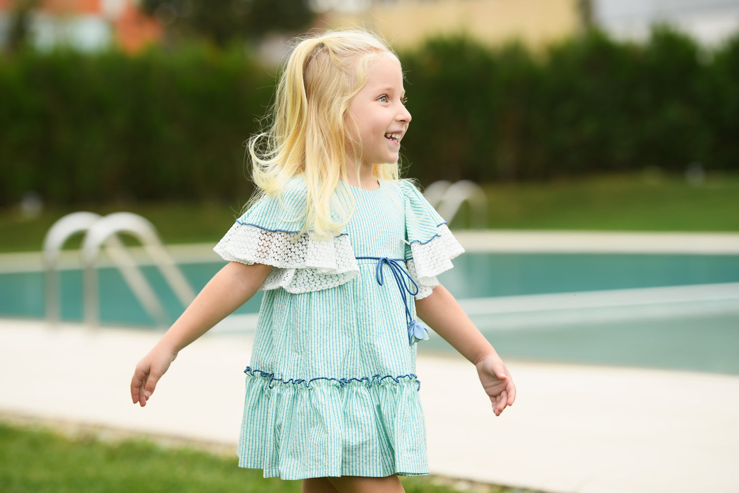 Lindo vestido da marca espanhola Foque. Confecionado em tecido seersucker leve e fresco com padrão riscado verde e azul. Um estilo encantador para este verão, com mangas esvoaçantes e detalhes em renda de crochê. Tem acabamentos em azul e um pequeno laço com terminação em flores. A saia tem uma adorável barra franzida para um caimento perfeito. É totalmente forrado para maior conforto e aperta nas costas com fecho invisível.
