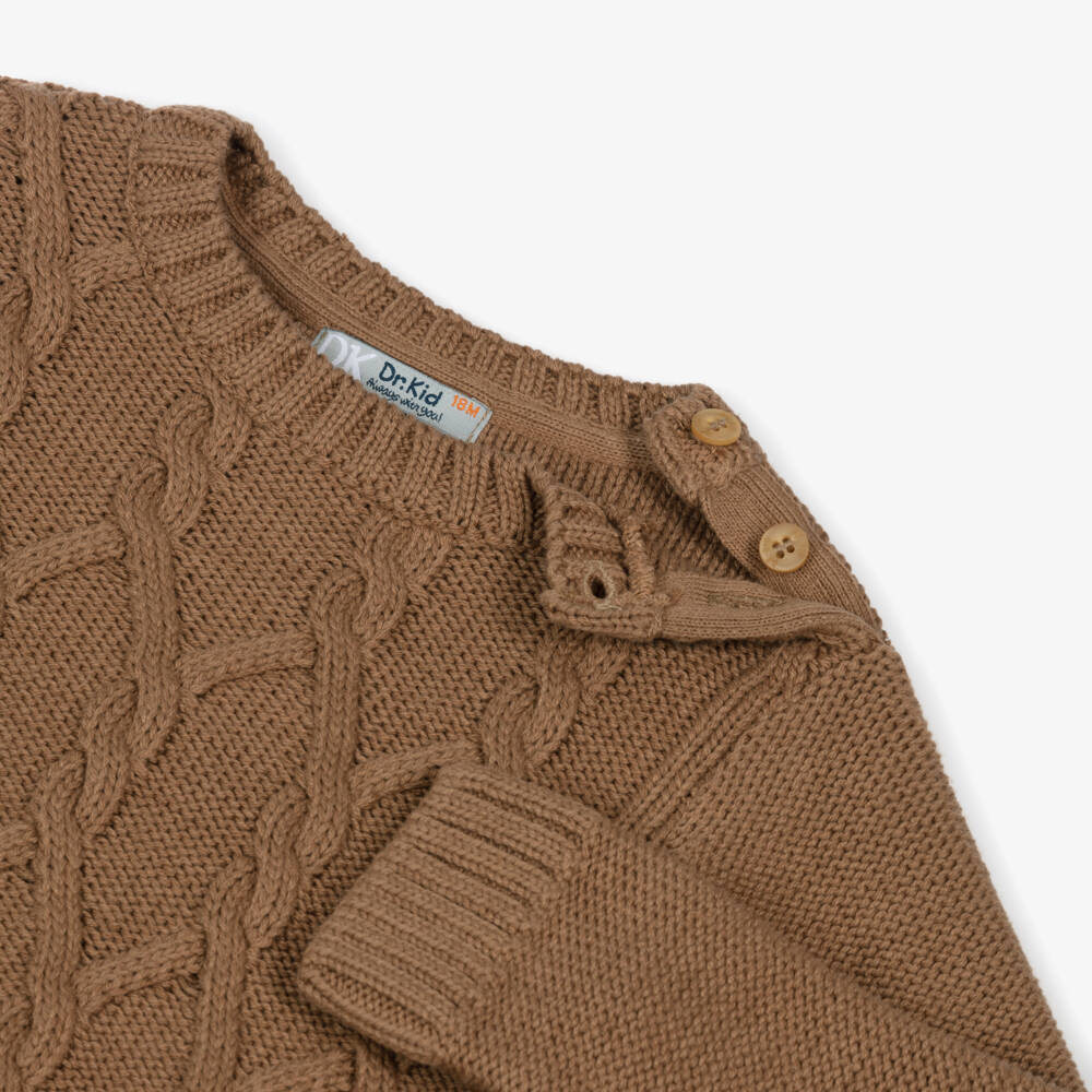 Camisola menino em malha da marca portuguesa Dr.Kid. Tricotada numa mistura super macia de algodão. Com o clássico padrão trançado na frente, para um look casual ou mais elegante. Os tamanhos mais pequenos têm abertura no ombro em botões para vestir facilmente. A gola, punhos e bainha é levemente canelada para melhor ajuste e conforto.