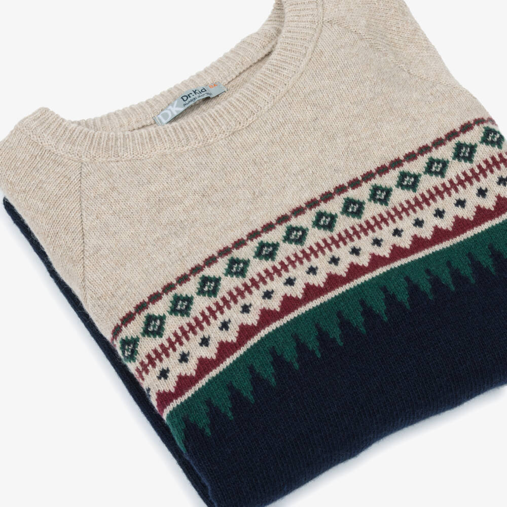 Camisola malha menino da marca portuguesa Dr.Kid. Tricotada numa mistura macia de lã e algodão em bege e azul marinho. Com o clássico padrão Fair Isle em verde garrafa e bordeaux. Tem gola, punhos e bainha levemente canelados para maior conforto e ajuste.