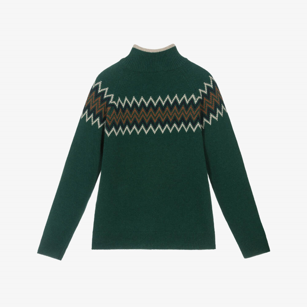 Camisola malha verde para meninos da marca portuguesa Dr.Kid. Tricotada numa mistura macia de algodão e lã, muito aconchegante e confortável. Com padrão tradicional Fair Isle em tom crú, azul e castanho. Tem gola canelada e aperta com botões.
