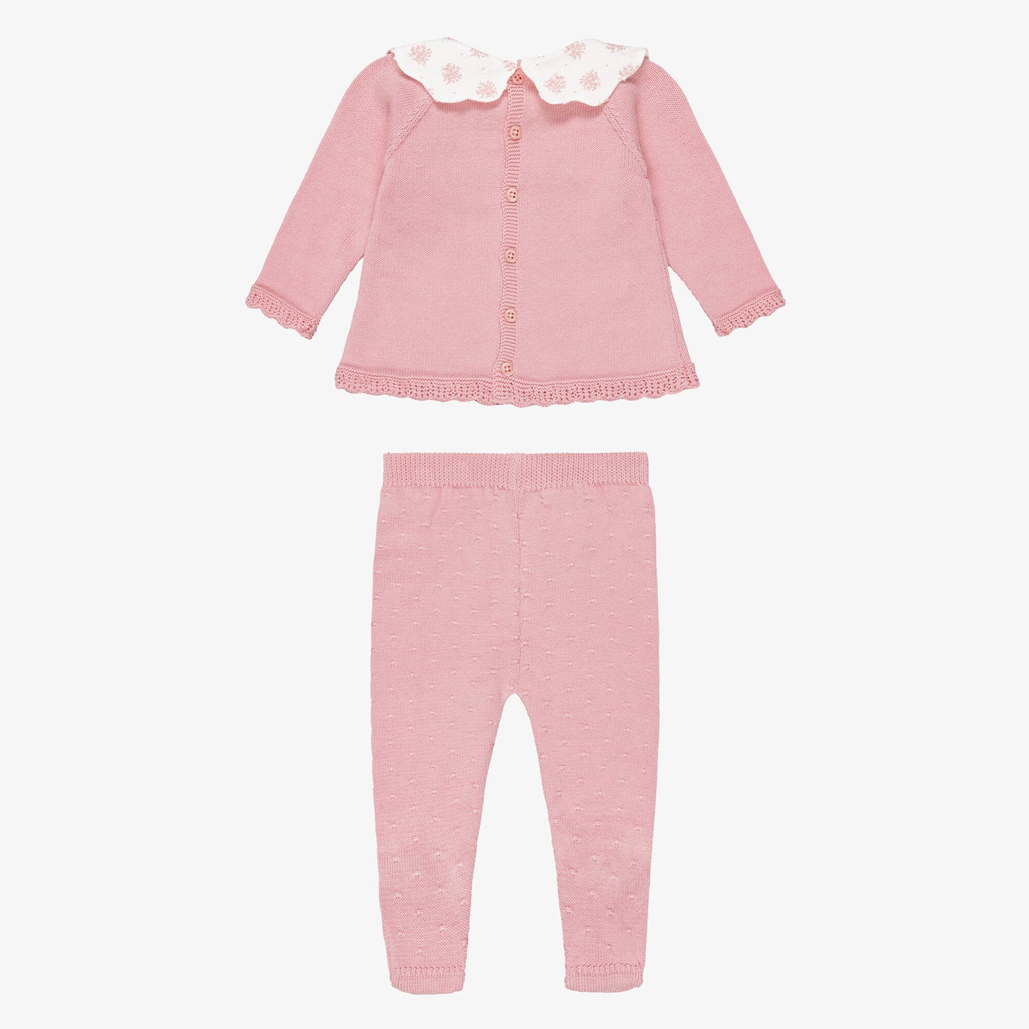 Adorável conjunto rosa de duas peças para meninas por Paz Rodríguez, combinando charme e conforto. Tricotada em algodão macio com um padrão delicado, tem uma gola incorporada com flores rosa. A camisola aperta nas costas com botões. As calças coordenadas têm um estilo simples ,cintura elástica confortável e os pés são fechados .