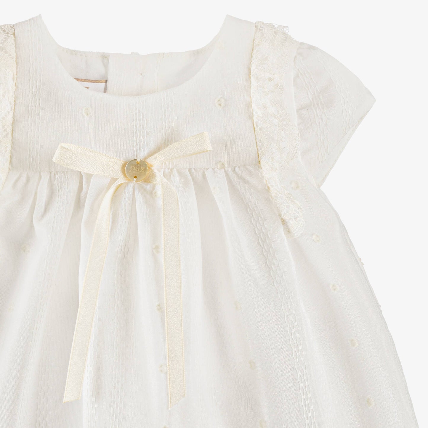 Vestido e tapa fralda cru da marca espanhola Paz Rodríguez. Produzida em tecido macio e leve, o vestido possui delicados enfeites de renda e um laço de cetim na frente. Combina lindamente com e as cuecas elásticas para um visual tradicional.
