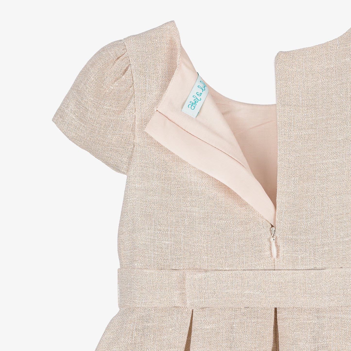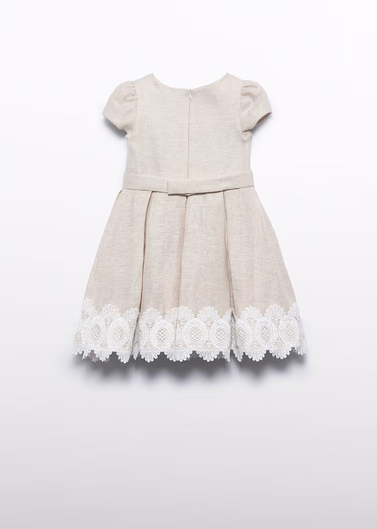 Vestido bege com fio dourado para meninas da Abel & Lula. Produzido numa mistura leve de linho. Um estilo encantador para uma ocasião especial, tem acabamento de renda branca. Dobrado para uma silhueta completa, é forrado para maior conforto e aperta com um zíper oculto.