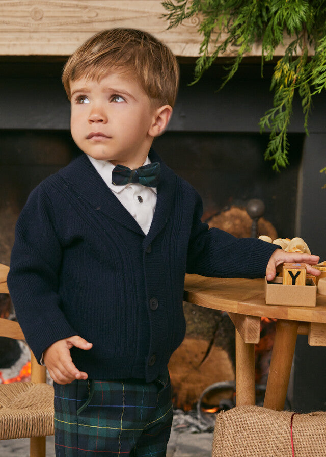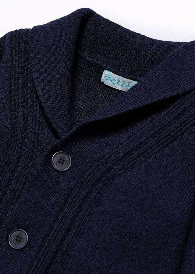 Navy blue coat for boys by Abel & Lula. Knitted in a super soft viscose blend, it has a revere collar and a blue button fastening at the front. An elegant coat to complete a casual or more festive look.