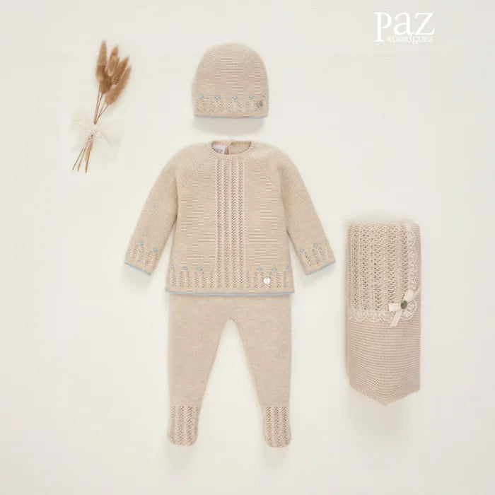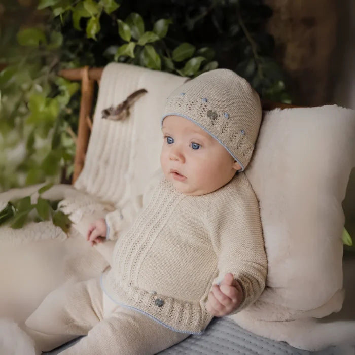 Beige beanie hat for boys and girls from Paz Rodríguez, with a classic style. Made from a soft cotton blend with a cashmere feel, it features a delicate lace print on the brim and light blue embroidered details.