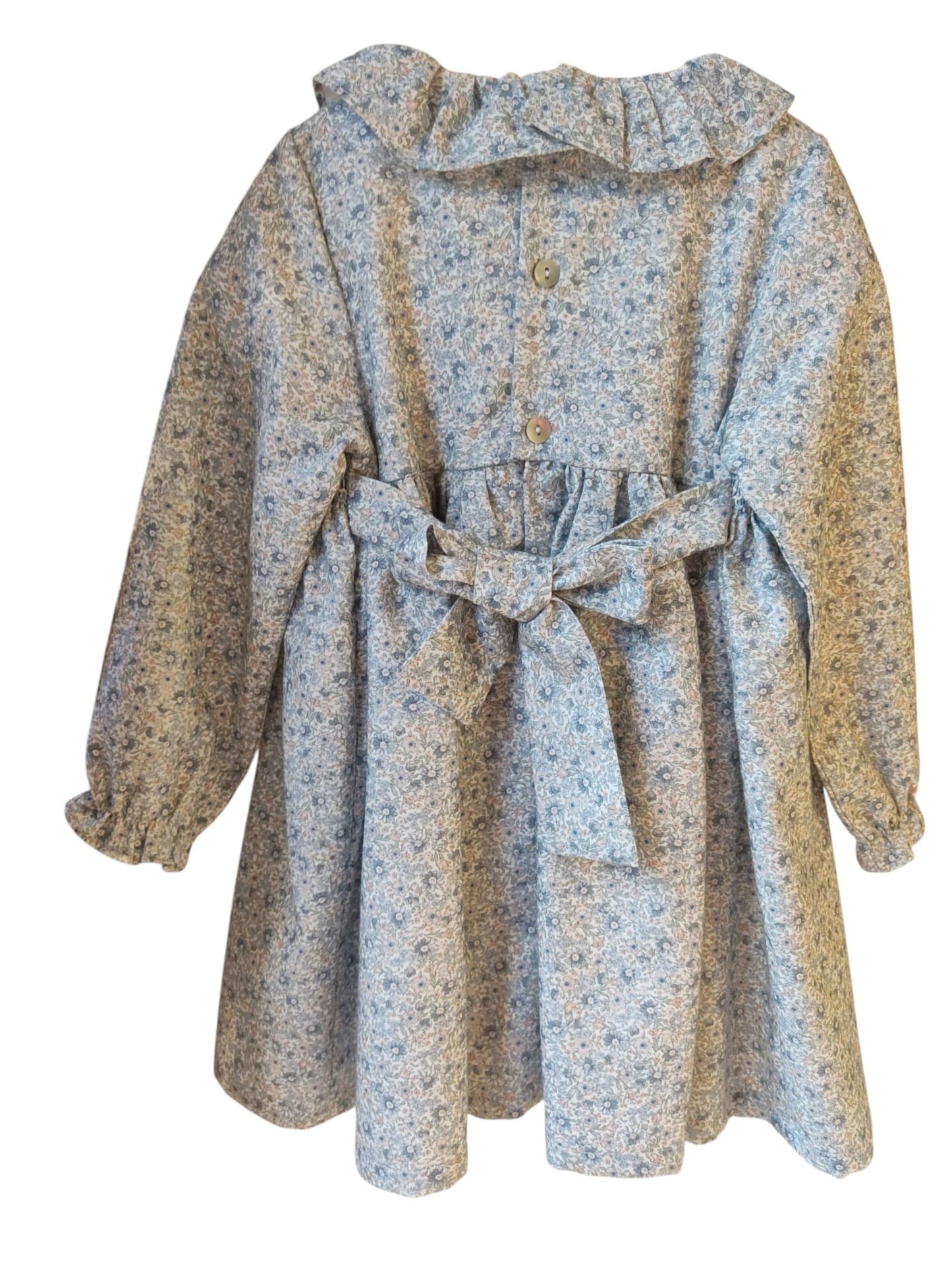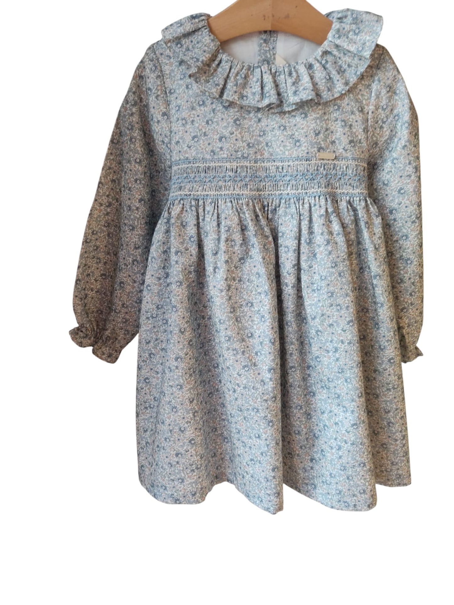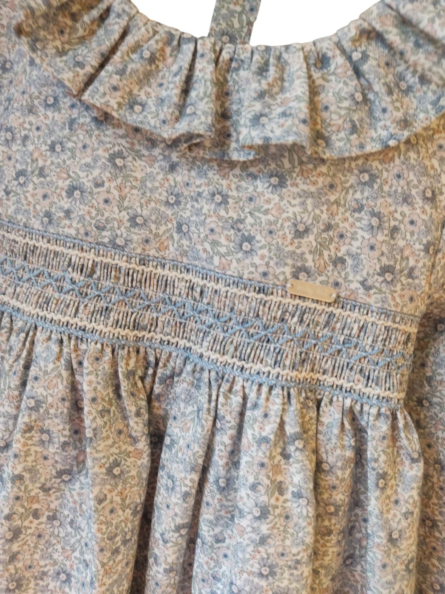 Beautiful dress from Portuguese brand Baby Lai. Made of fabric with a floral print in shades of blue and beige. It has a wonderful ruffled collar. On the chest, there's a panel of elastic honeycomb embroidered in light blue, and slightly elastic cuffs. At the back, there's a belt that allows you to tie a bow. It's fully lined and closes with mother-of-pearl buttons.