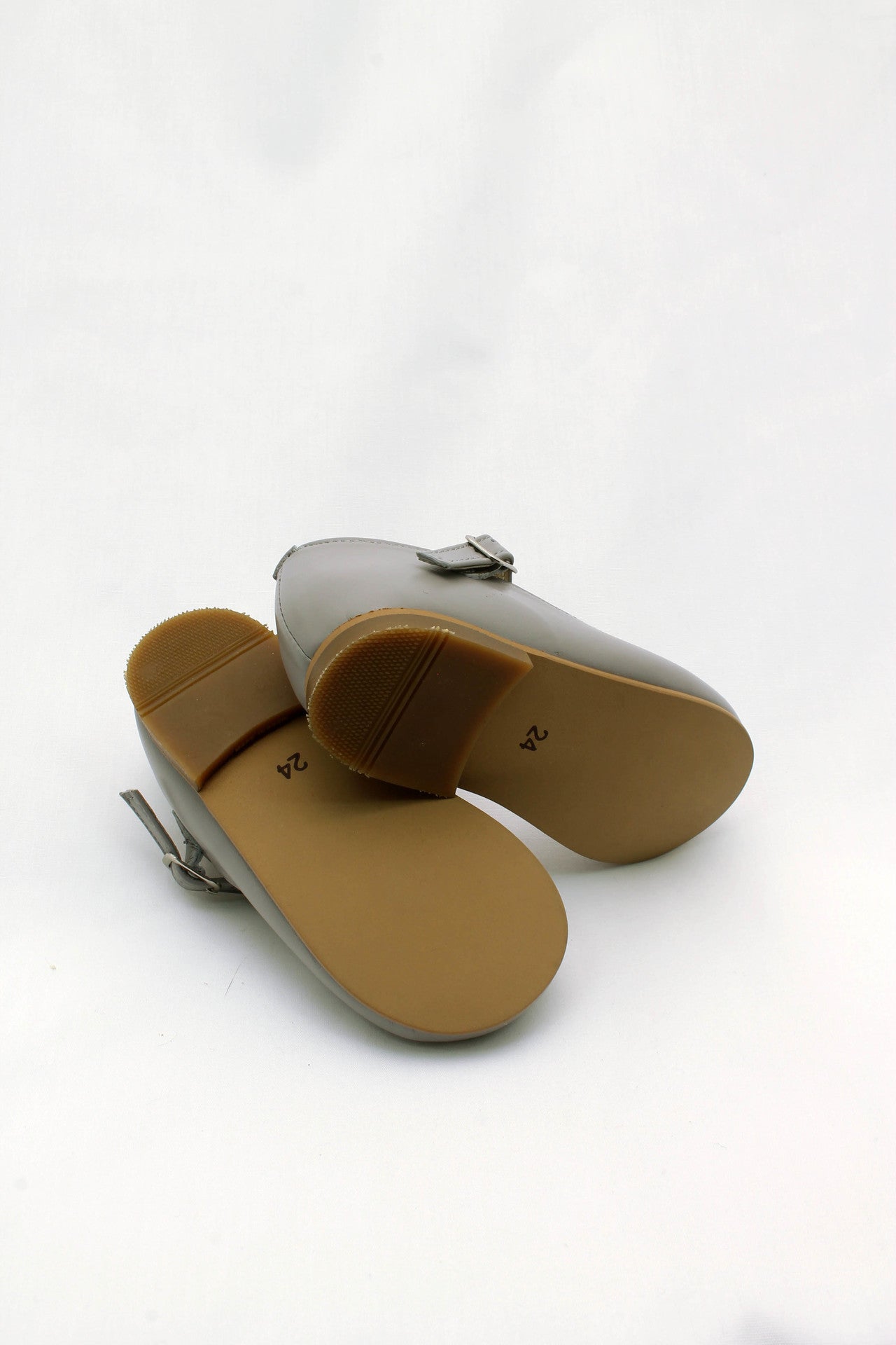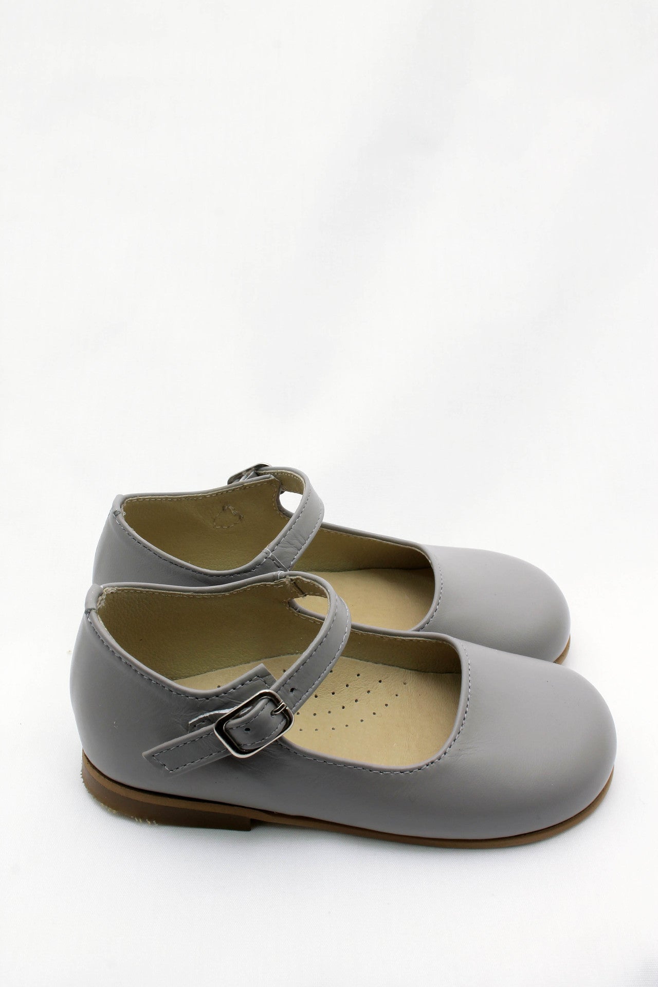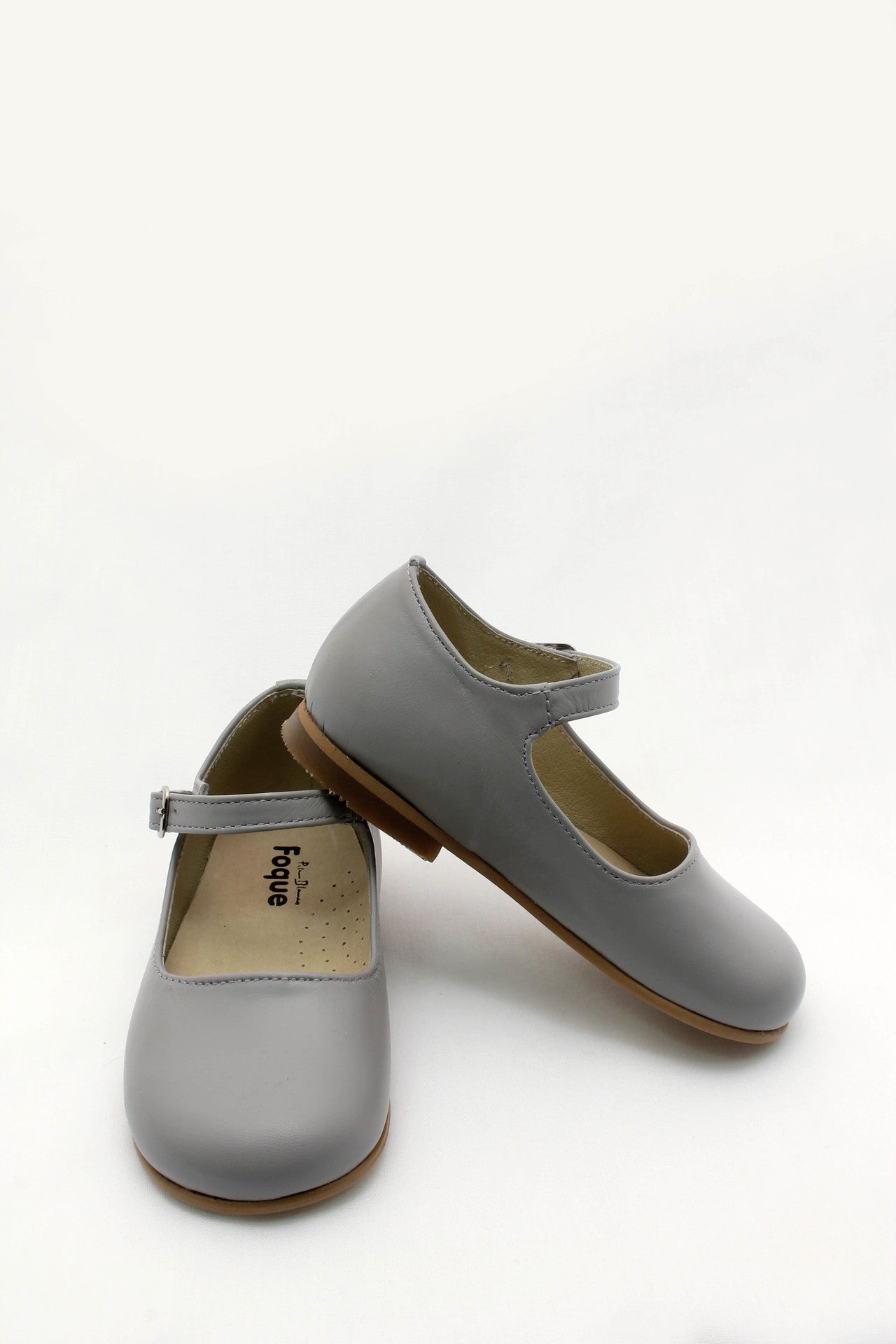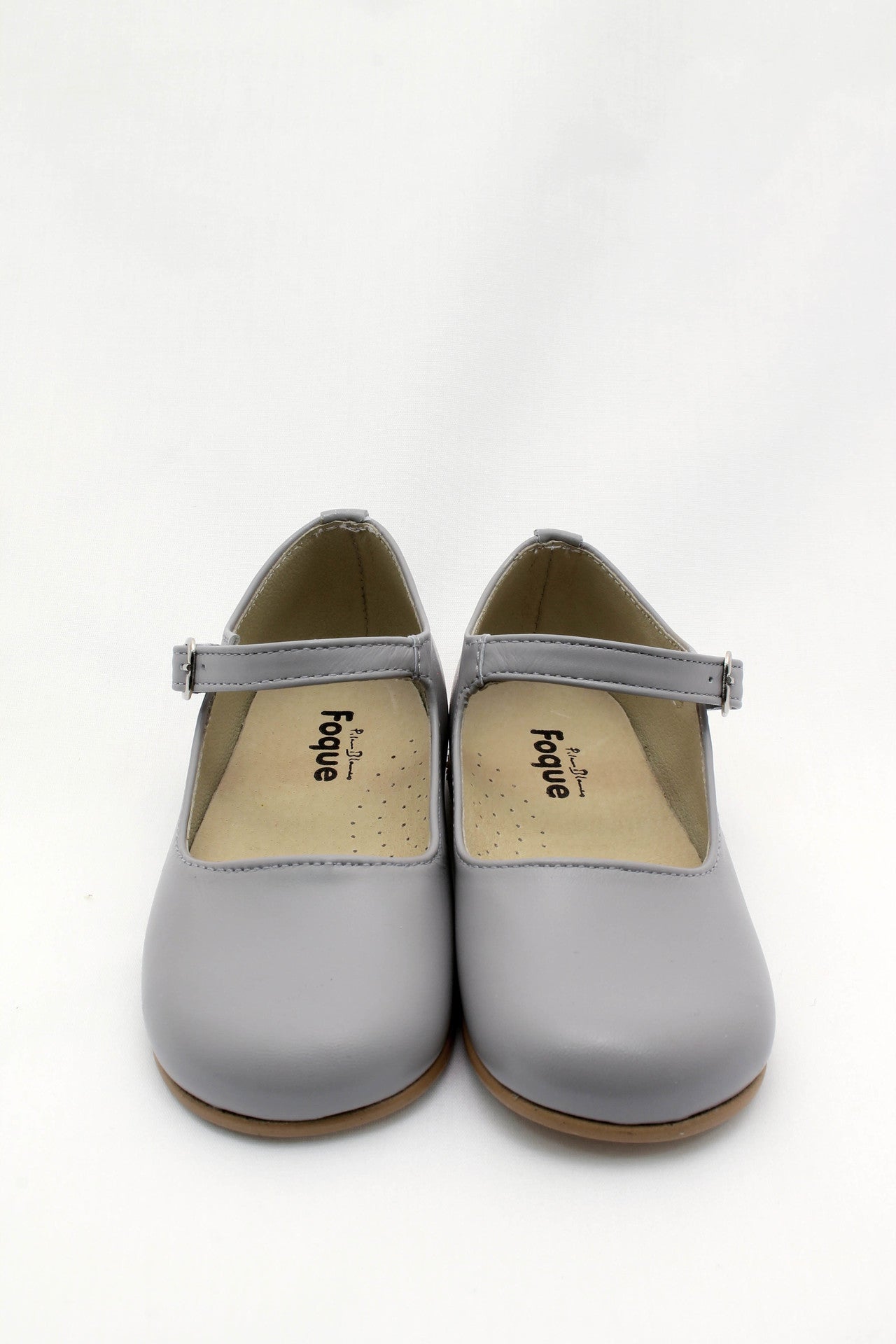 Girls' shoes from the Spanish brand Foque. Made of light gray leather. A classic and timeless style that adapts to any look. Buckle fastening.