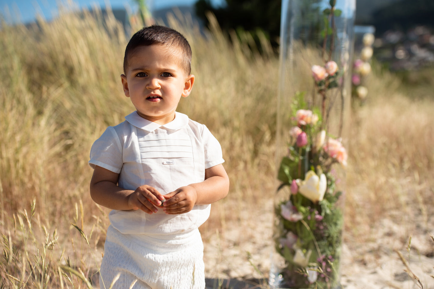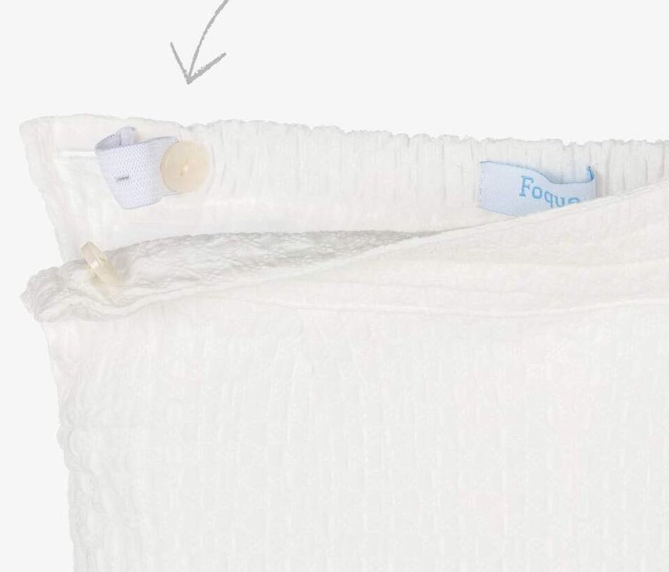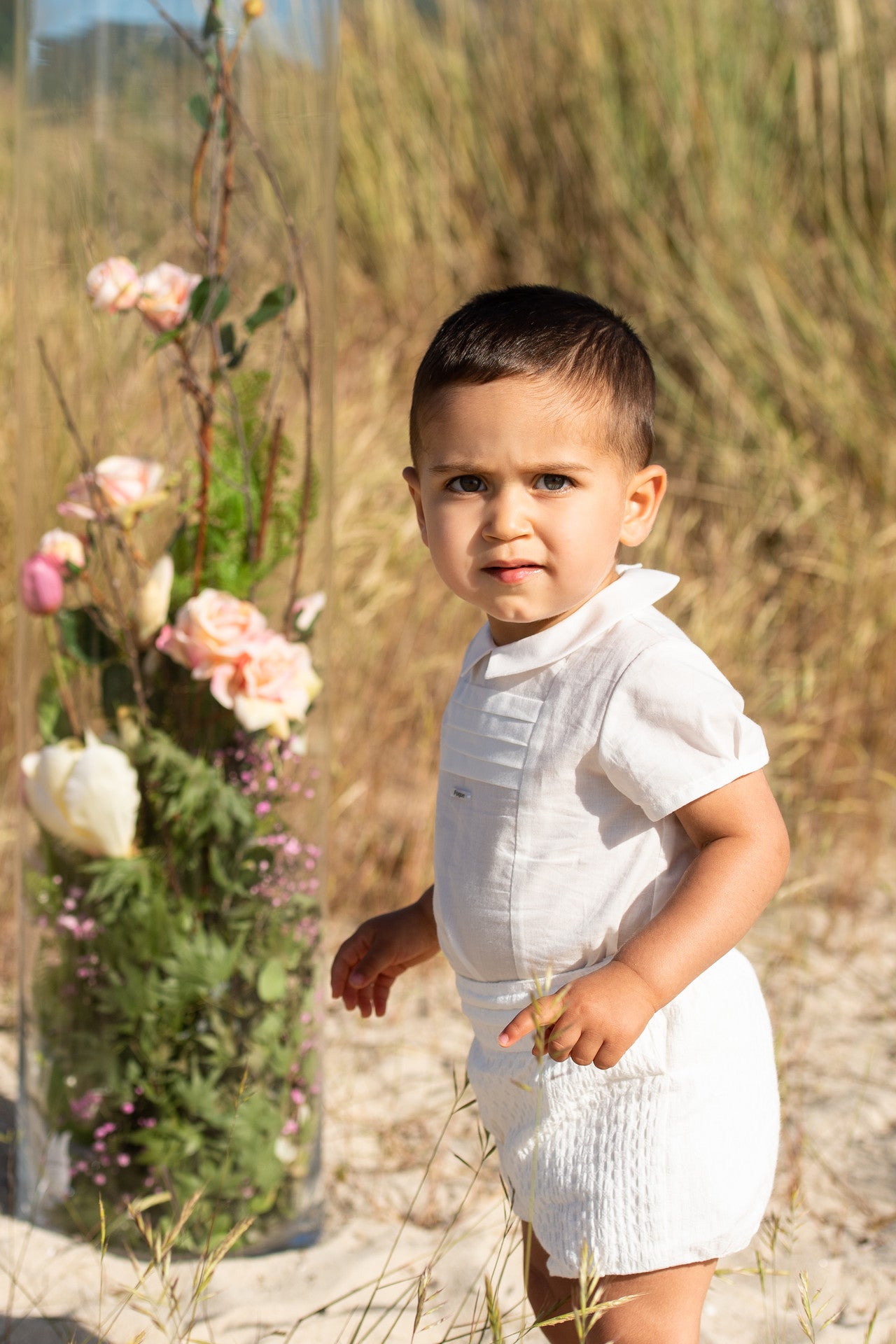 A traditional-style pearl cotton shorts and shirt set for boys from the Spanish brand Foque. The short-sleeved shirt features an elegant collar and pleats on the front. It fastens with buttons in the back. The shorts feature a beautiful printed fabric with pleats at the front waist. Fully lined, it closes with buttons on the sides and has an adjustable waistband for a comfortable fit.