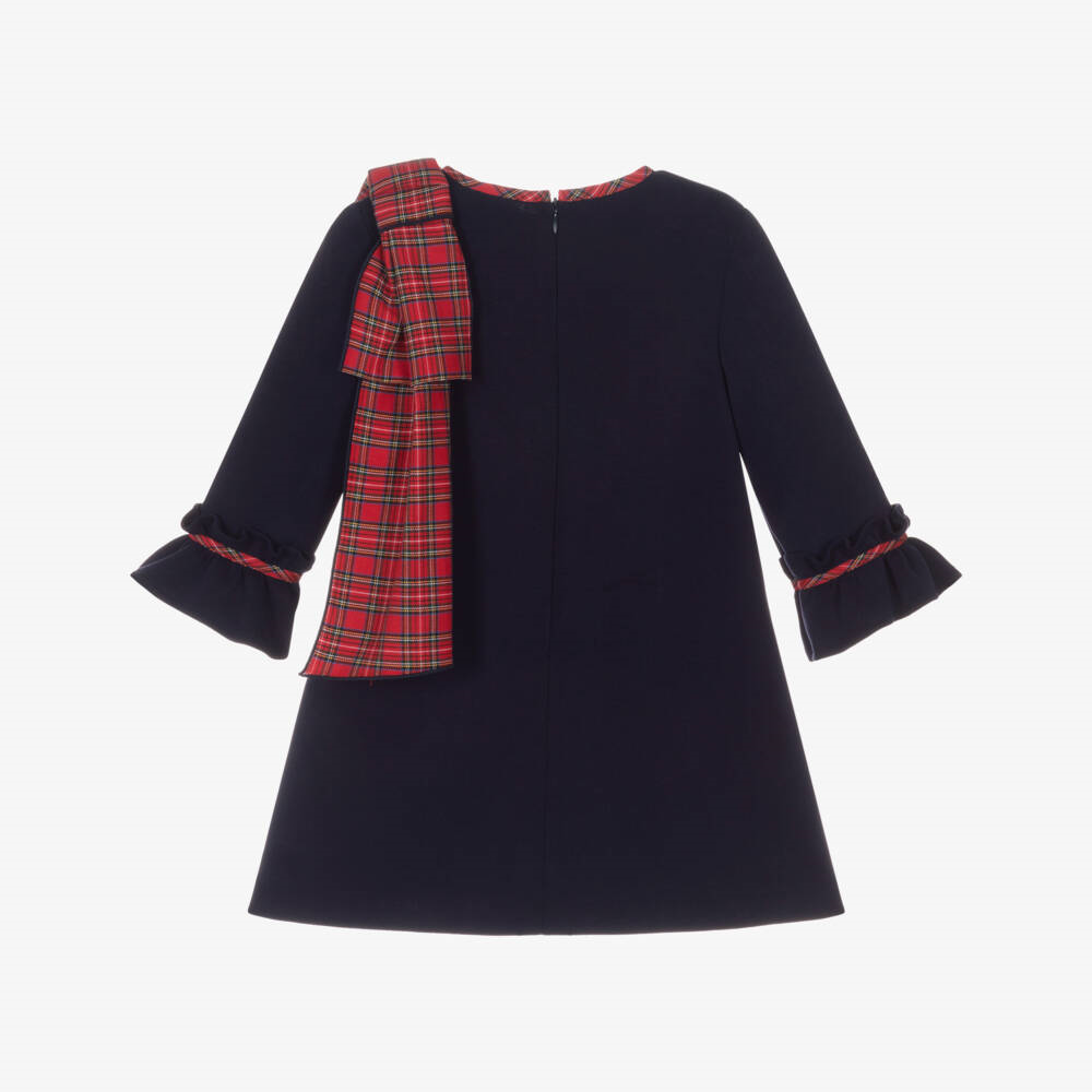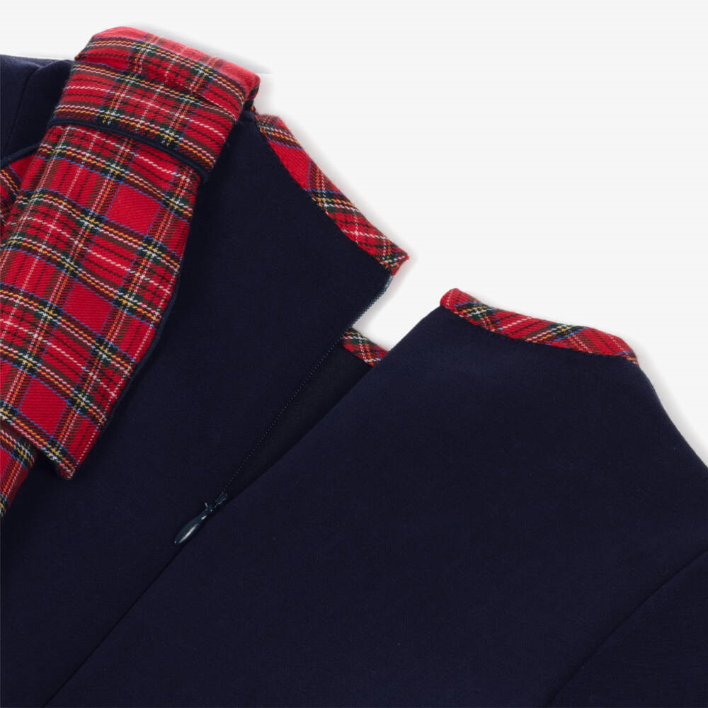 Beautiful navy blue dress from Spanish brand Foque. Made from soft and comfortable double viscose jersey. A very elegant design, it features a stunning red plaid bow on the shoulder and matching details on the neckline and sleeves. It closes in the back with an invisible zipper.