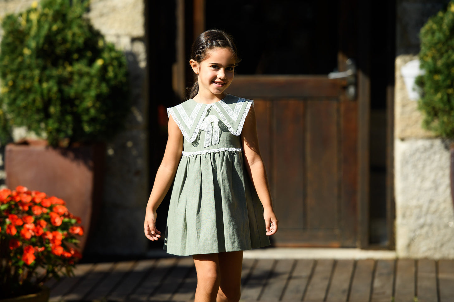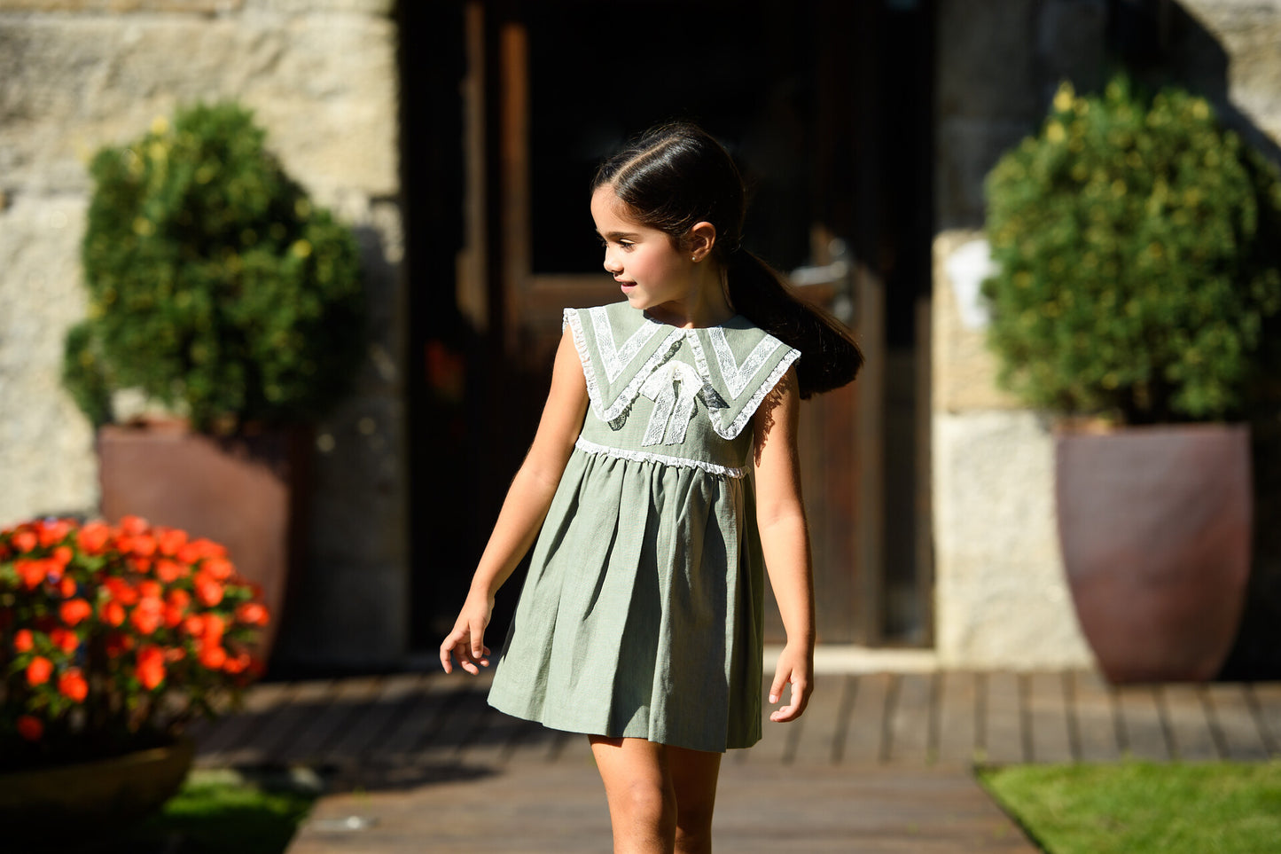 GREEN LINEN DRESS WITH PEARL LACE BY FOQUE