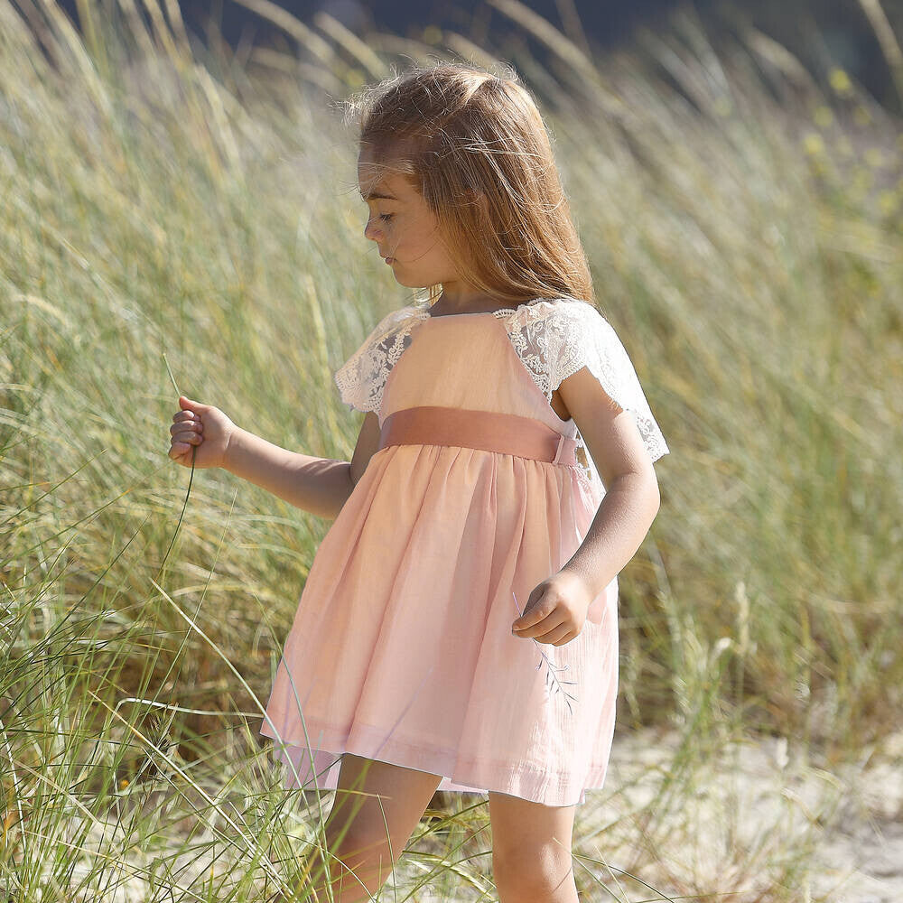 A stunning nude-pink dress from Foque, crafted from a fine, lightweight cotton fabric. It features exquisite ecru lace sleeves that extend down the back, creating a stunning V-neckline for an even more beautiful look. Fully lined for comfort, it closes in the back with an invisible zipper and comes with a removable green satin ribbon.