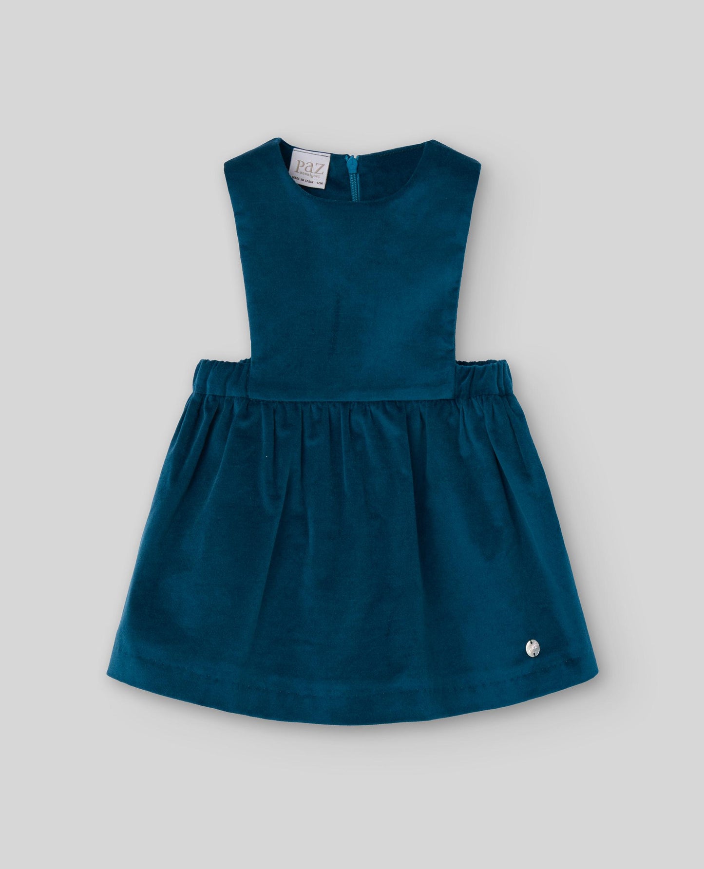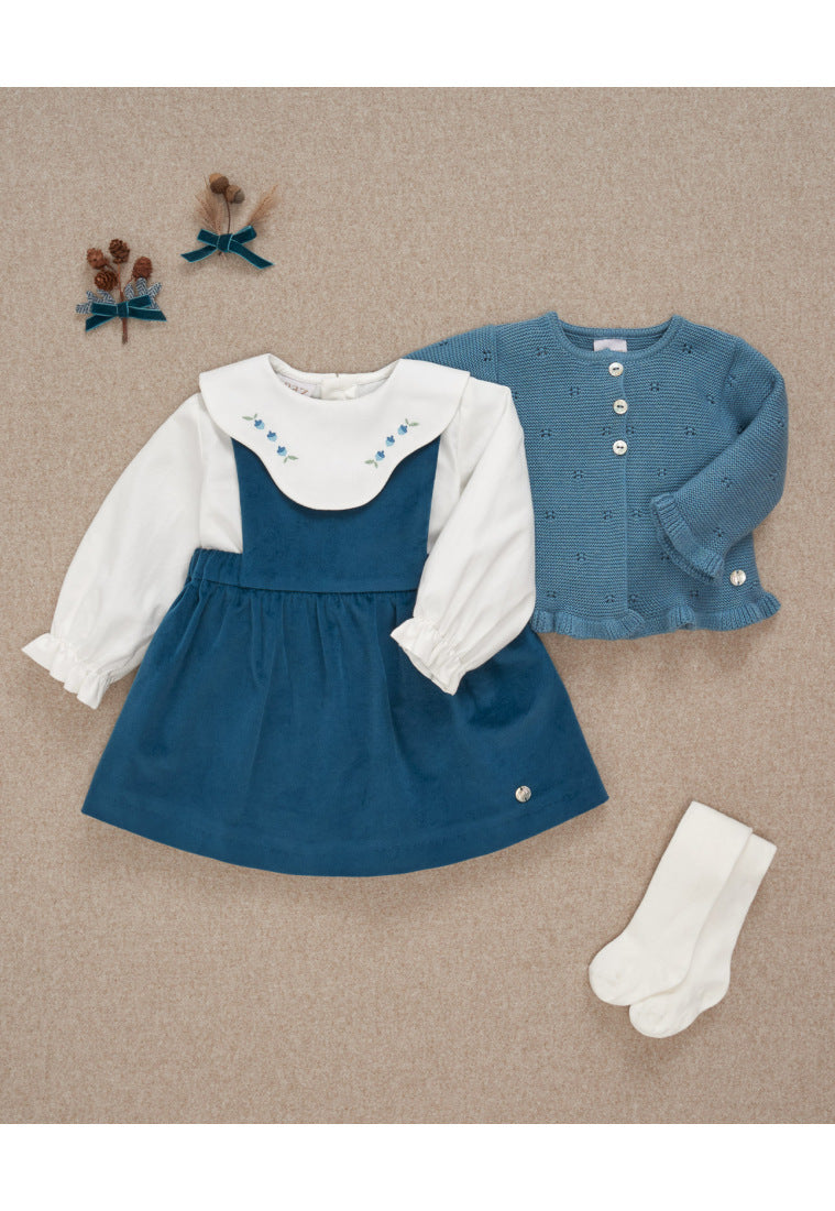 Num bonito tom de azul turquesa, este encantador conjunto para meninas é da Paz Rodríguez. A blusa em tecido macio em tom cru com gola estruturada, delicadamente bordada com lindas flores em tons de azul. Tem mangas bufantes compridas e aperta com botões nas costas. A saia de peitilho coordenada em veludo macio, com cintura elástica confortável . Fecho zíper invisível .