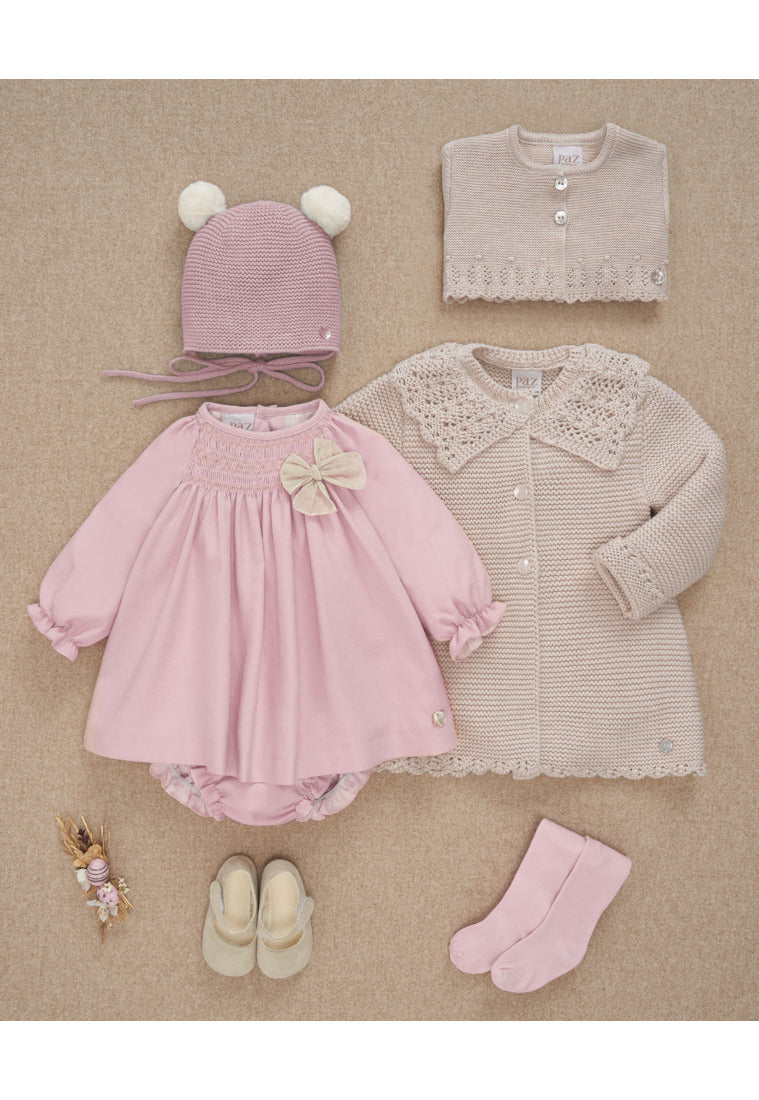 Vestido e tapa fralda de algodão rosa e bege para bebé da Paz Rodriguez