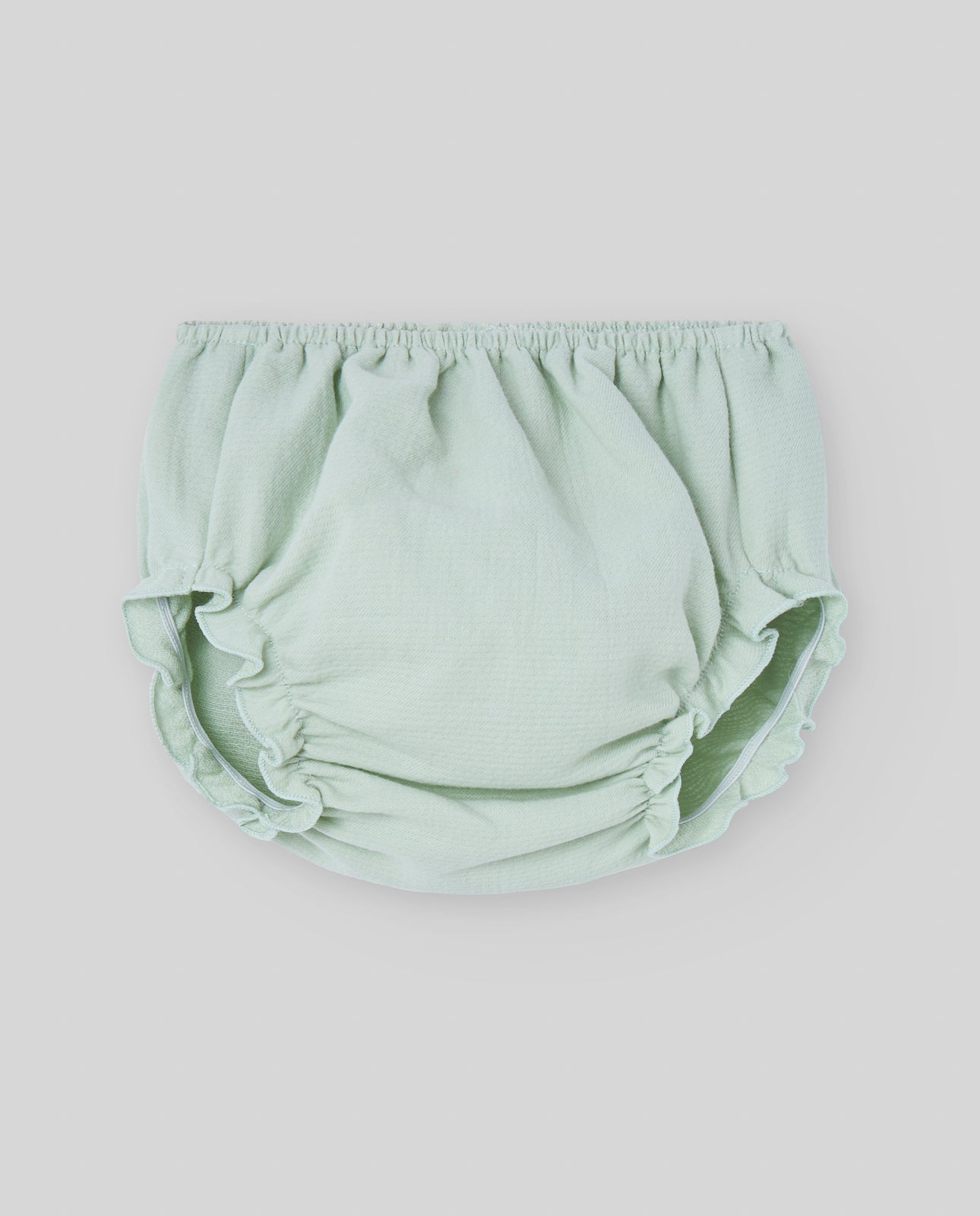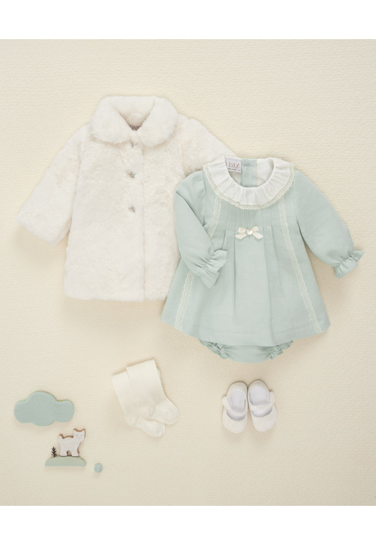 Vestido verde para meninas da Paz Rodríguez, produzido em tecido de algodão macio com aplicação de renda branca. Este bonito vestido de mangas compridas é forrado ,decote redondo com delicada gola de babados com acabamento em renda. Forrado em voil leve, o vestido tem um delicado laço e um pingente com o logotipo em madrepérola na frente para finalizar. Aperta com botões nas costas.