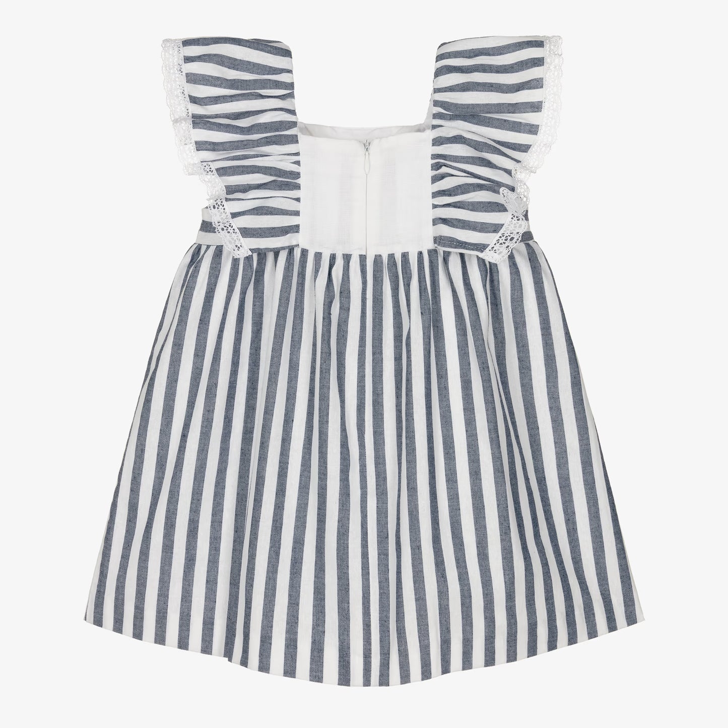 Vestido listrado em branco e azul marinho da PAZ Rodríguez, um look encantador e veranil para meninas. Produzido numa suave mistura de algodão e linho, apresenta delicados babados com acabamento em renda. Totalmente forrado para maior conforto, possui um zíper discreto e invisível nas costas.