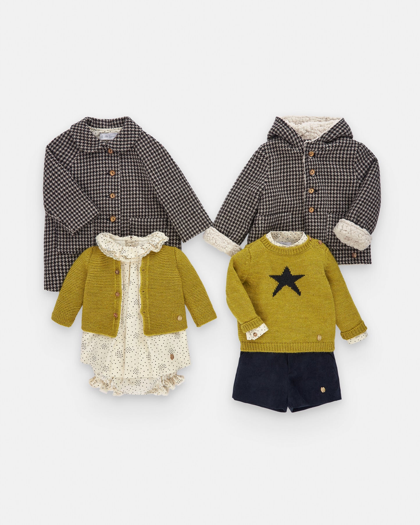 Girl's coat in fabric with "rooster's foot" print by Pili Carrera