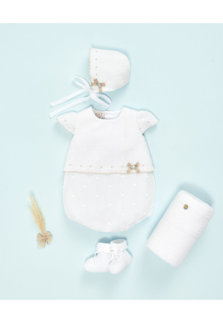 White knit and fabric romper from the Spanish brand Paz Rodríguez. The bodice is made from a soft cotton knit with beige trim. The bottom is made from a soft cotton blend with embroidered polka dots and is fully lined for greater comfort. It fastens with buttons at the back and between the legs for easy dressing and diaper changes.