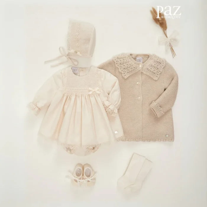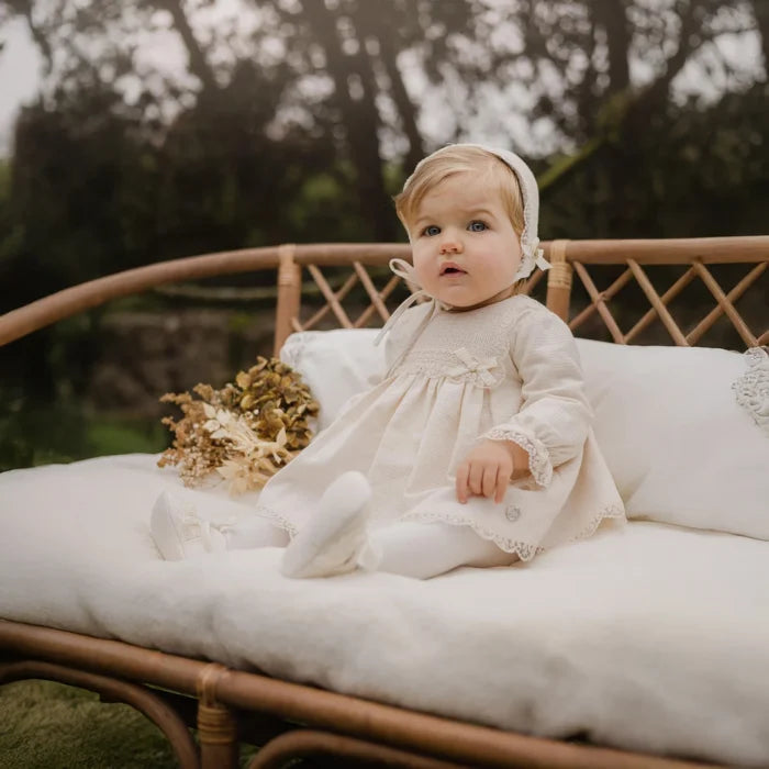 Perfect for a special occasion, this wonderful baby bonnet from Spanish brand Paz Rodríguez. Made of cotton with delicate lace trim, it's lined for comfort and closes with two ribbons below the chin. A bow and mother-of-pearl logo pendant add a delicate touch. It completes the classic and timeless look.