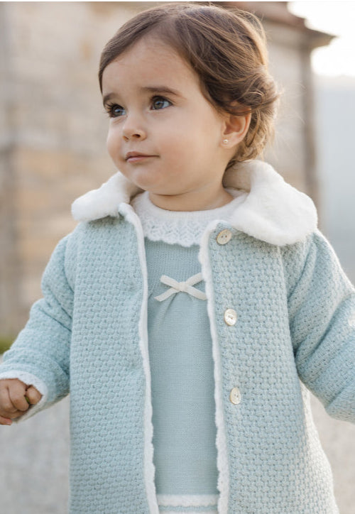 Soft, light green knit coat for girls from Spanish brand Paz Rodriguez. Traditionally styled, this cozy jacket features a super-soft faux fur collar and a beautiful scalloped knit trim. Lined with soft velvet for added warmth, it closes with mother-of-pearl branded buttons on the front. A delicate logo stitched just above the hem adds a beautiful finishing touch.