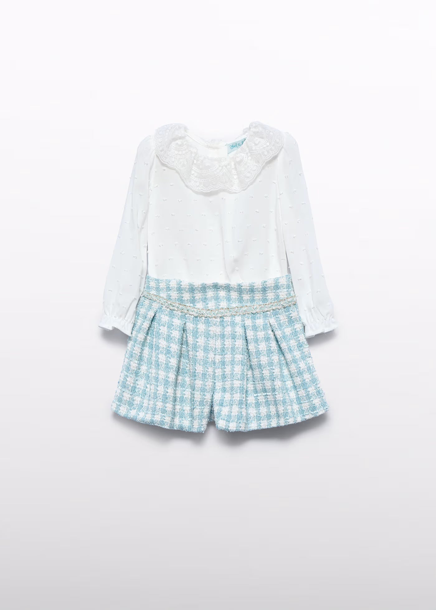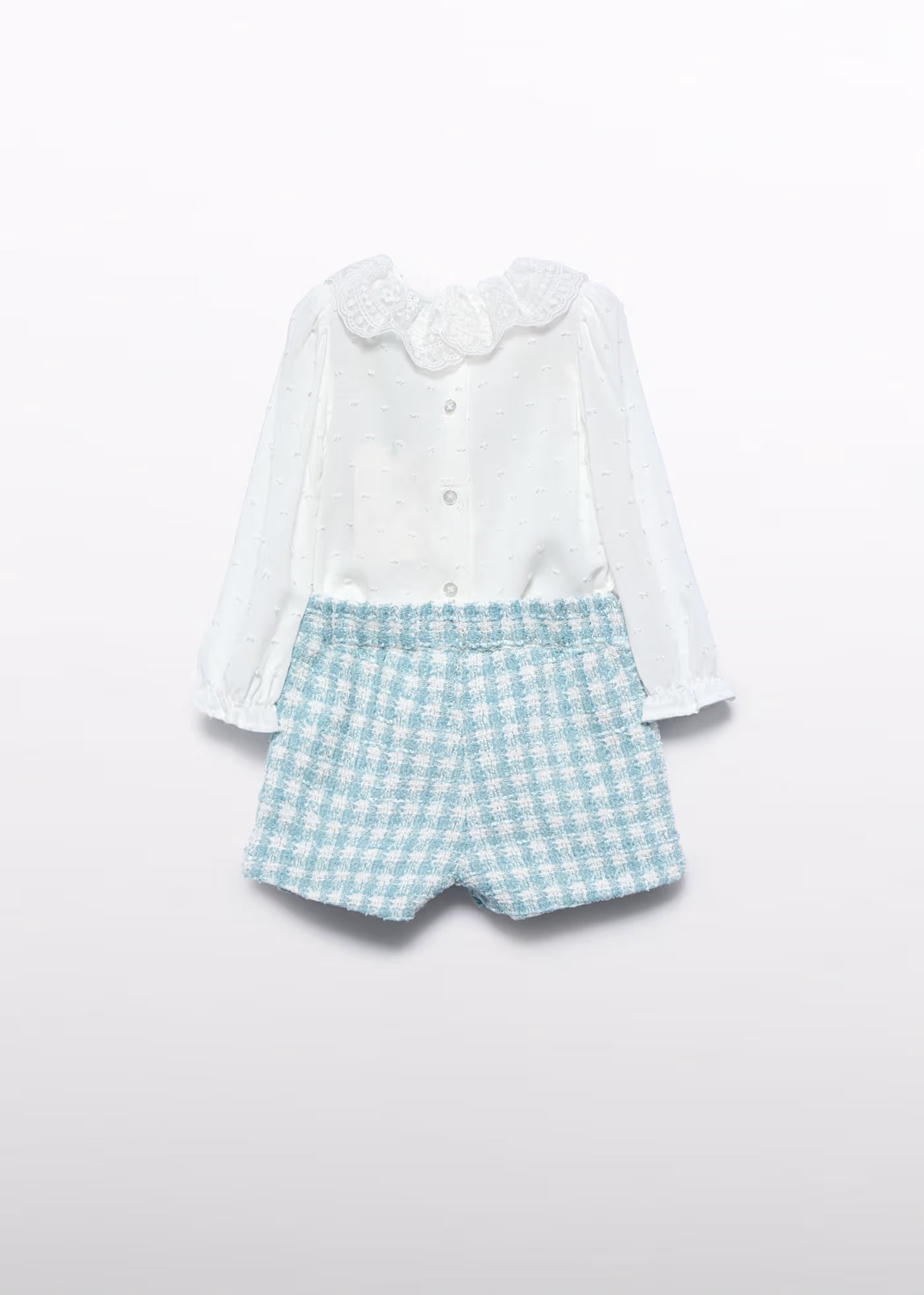 Abel & Lula's elegant blue tweed blouse and shorts set for girls. Made from soft viscose, the blouse features a lace collar. The shorts feature a shimmering gold thread. For added comfort, they feature an elastic waistband and cotton voile lining.