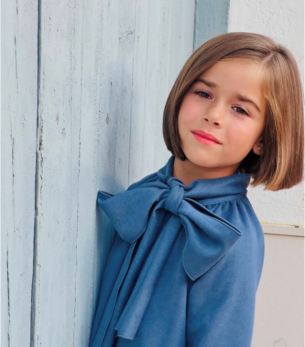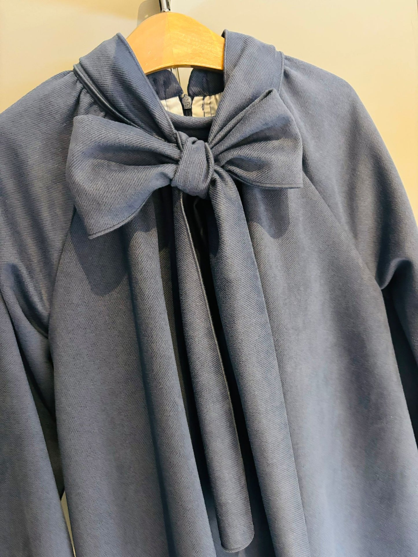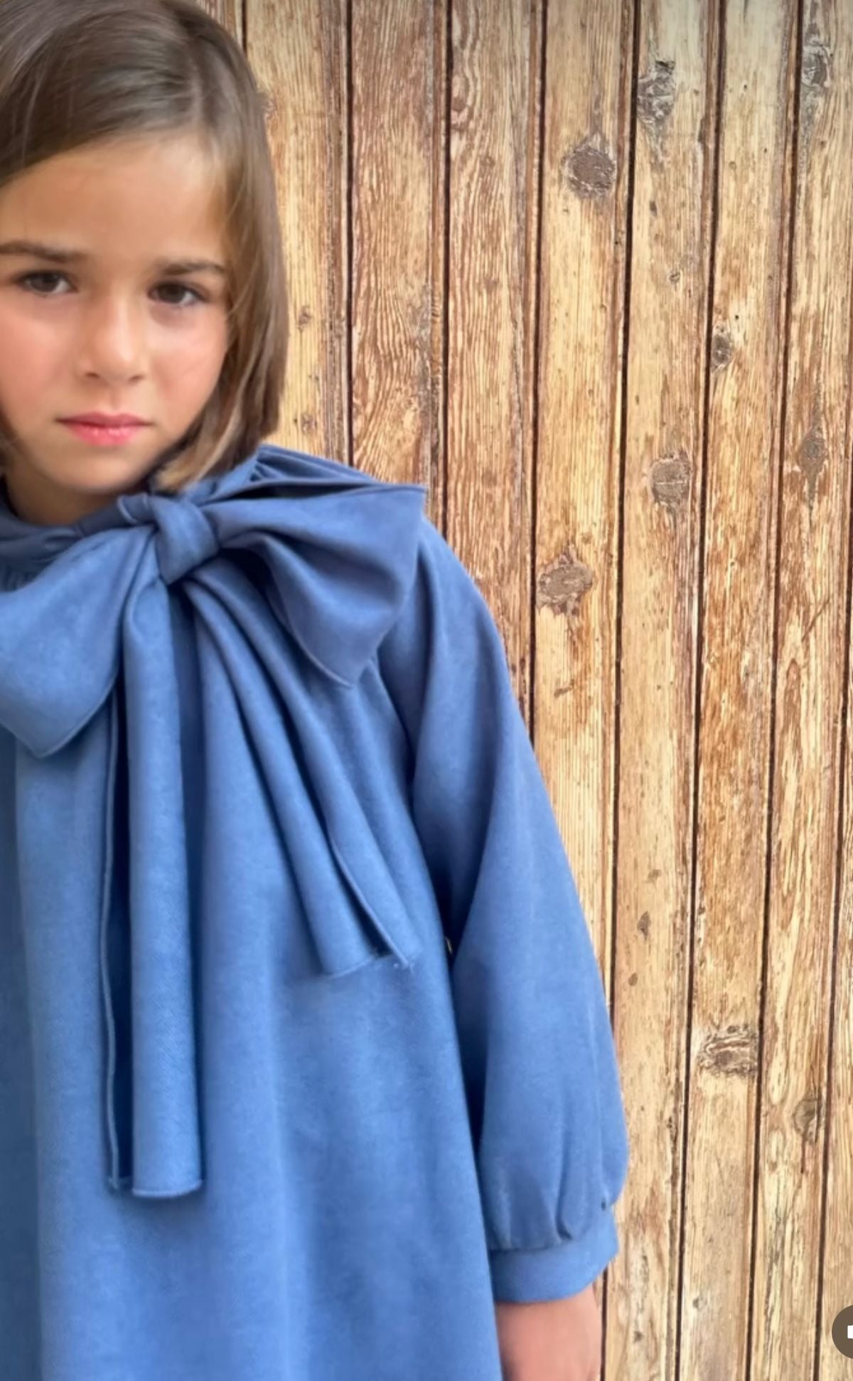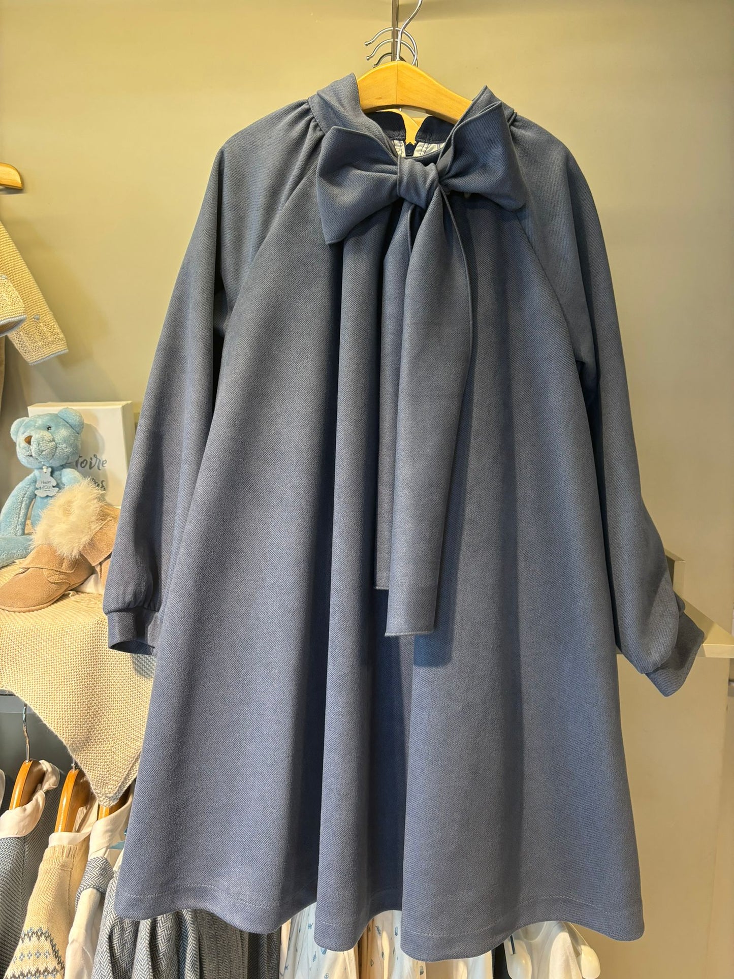 Lindo vestido da marca espanhola Eve Children. Confecionado em tecido azul indigo, leve e muito macio. Tem fola mandarim e duas fitas largas no decote, que permite fazer um maravilhoso laço. As mangas raglan são finalizados com um pequeno punho reto. É totalmente forrado para maior conforto e aperta nas costas com fecho invisível.