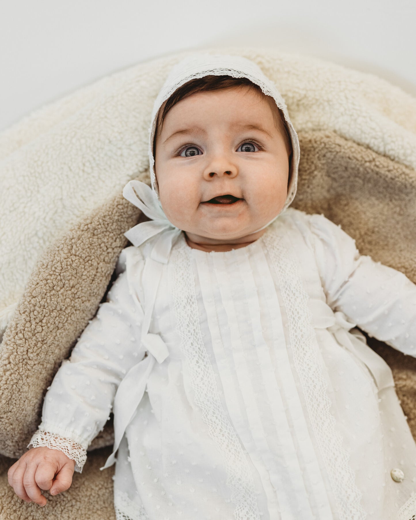 "Dulzura" christening dress with raw plumeti embroidery by Paz Rodríguez