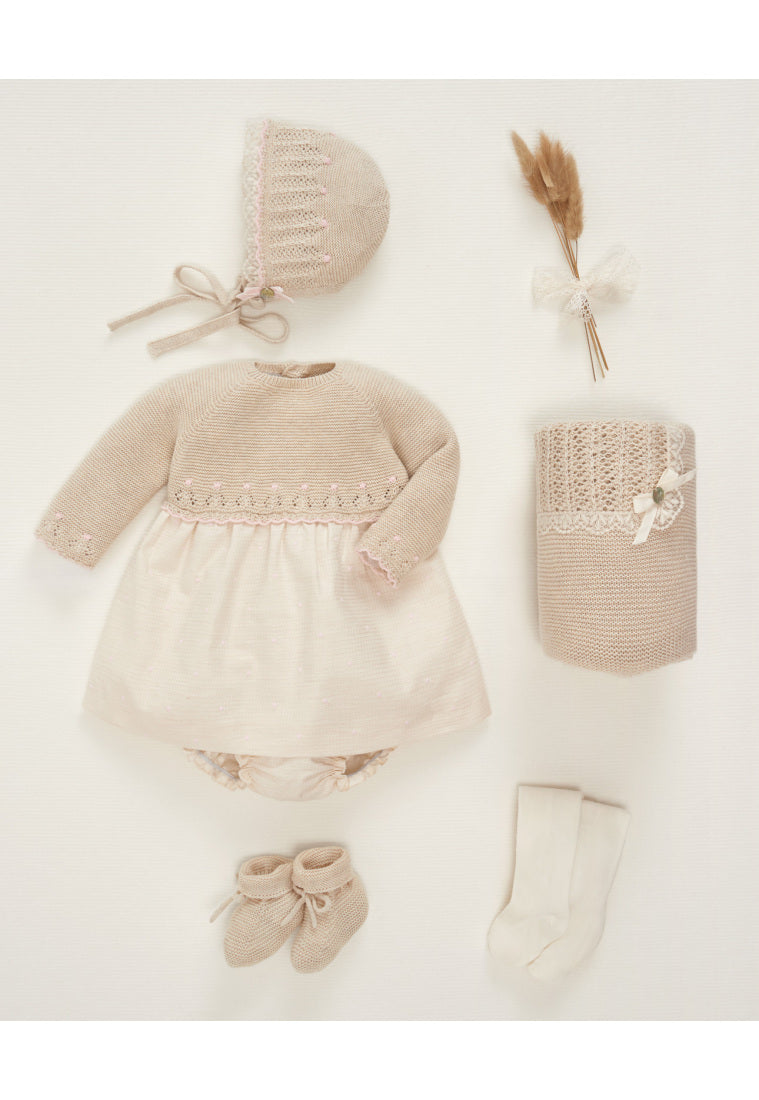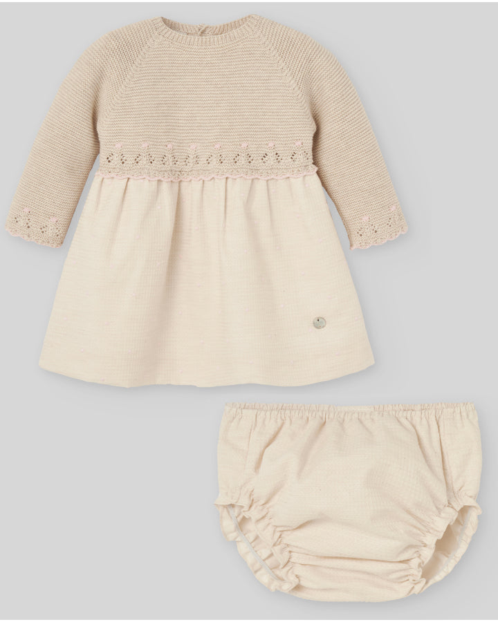 Beautiful beige dress for girls by Spanish brand Paz Rodríguez. The bodice is made of a soft cotton and cashmere knit with scalloped edges and a pink finish. The textured waffle-effect skirt features pink embroidered polka dots. Lined with cotton voile. It features a back button closure and a matching diaper cover to complete the look.