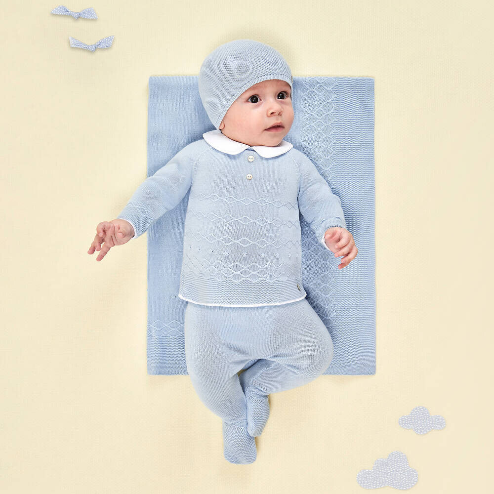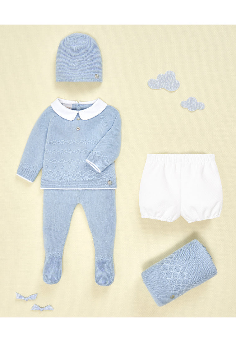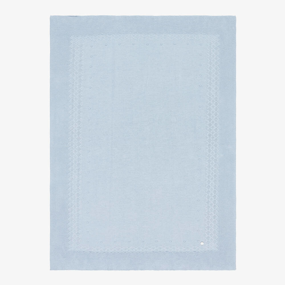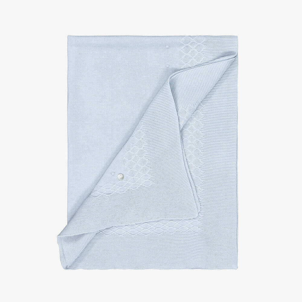 Preciosa manta azul para niños y niñas de Paz Rodríguez, tejida en suave algodón. Presenta un bordado de rombos y detalles de pompones en la parte delantera, con un logotipo de nácar en una esquina. Este precioso accesorio es ideal para usar en la habitación del bebé, en el cochecito o en la silla del coche.