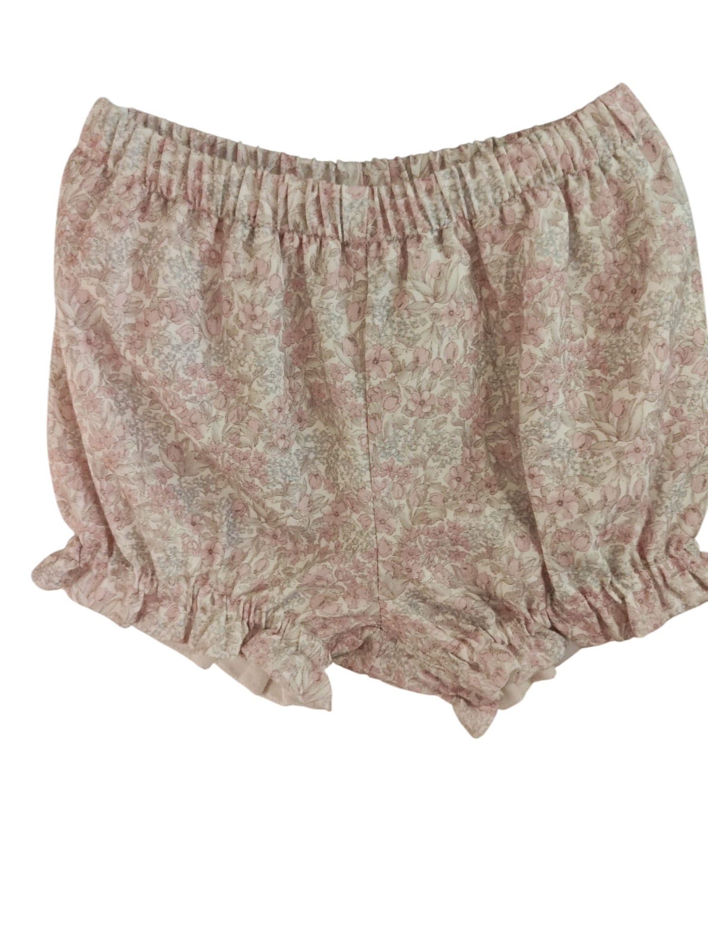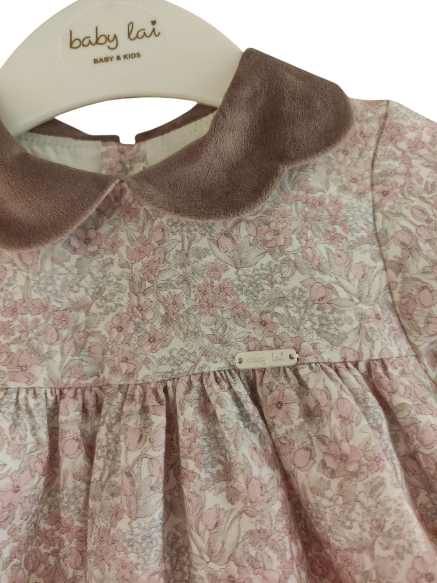 Maravilloso vestido de bebé con braguita de la marca portuguesa Baby Lai. Confeccionado en tela de algodón con estampado floral en rosa viejo y gris clérigo, presenta un precioso cuello festoneado de terciopelo berenjena con puños elásticos ligeramente bordados. Está completamente forrado y se cierra en la espalda con botones de nácar. El cubrepañal tiene cintura y piernas ligeramente elásticas para mayor comodidad.