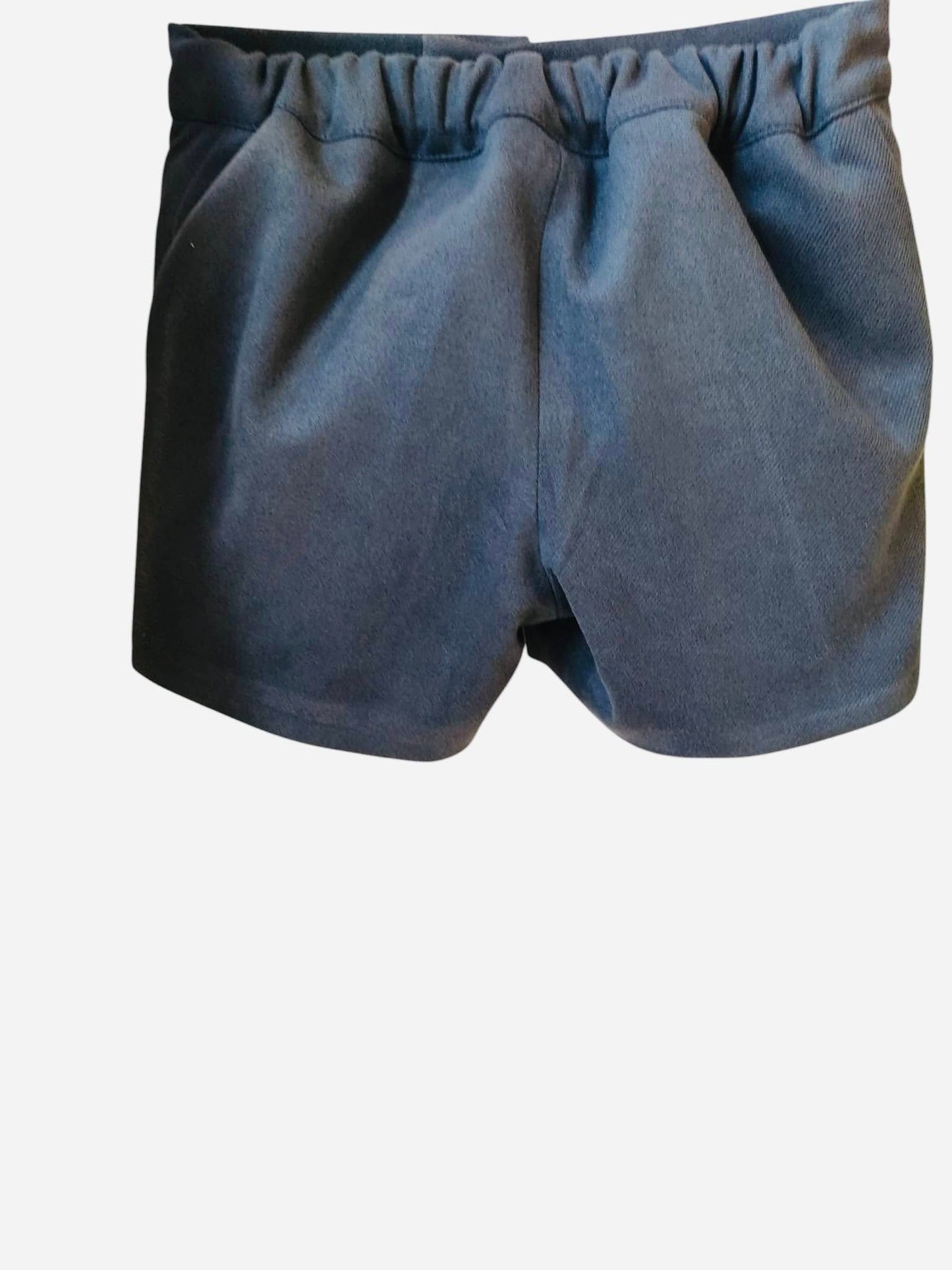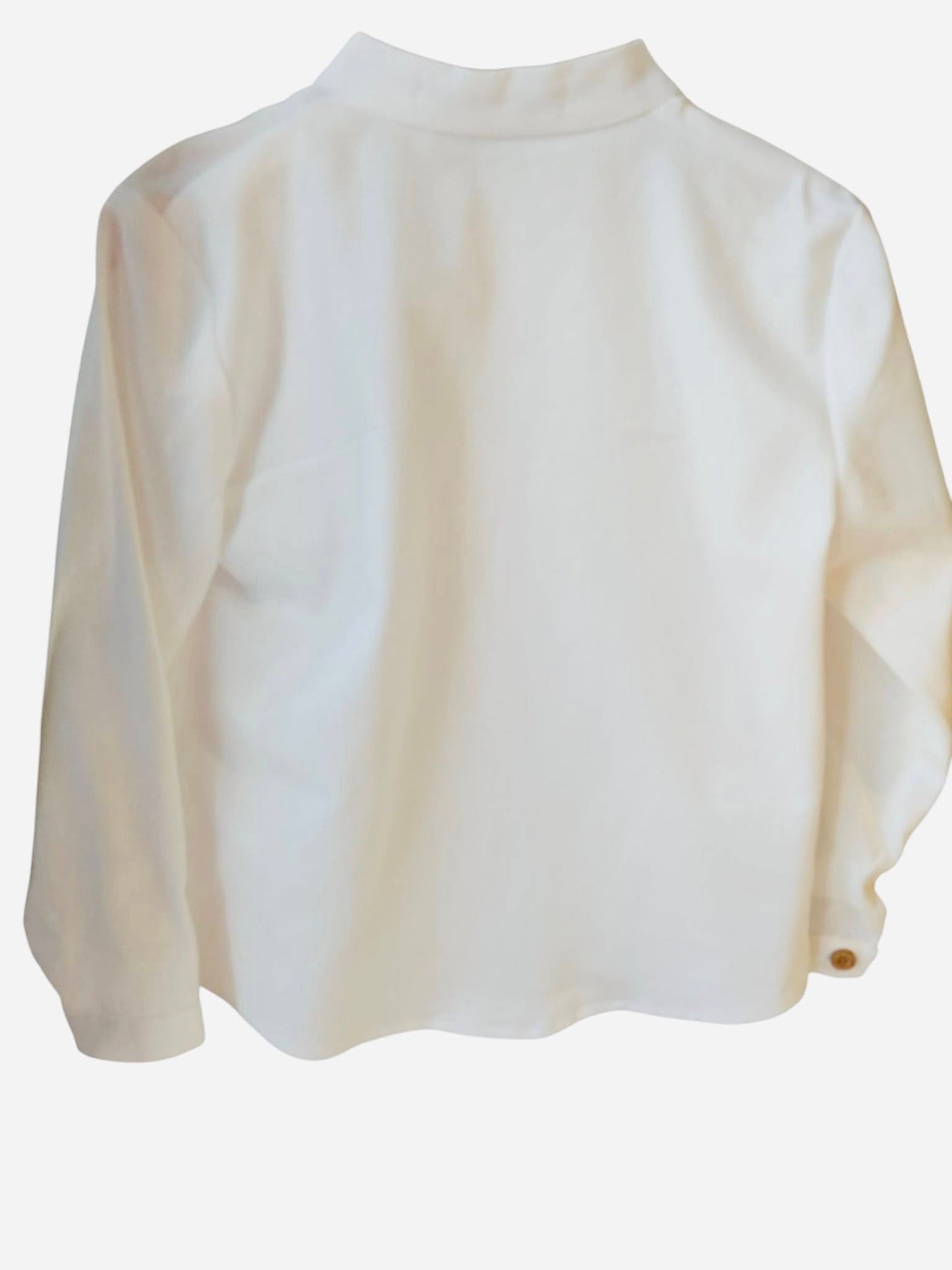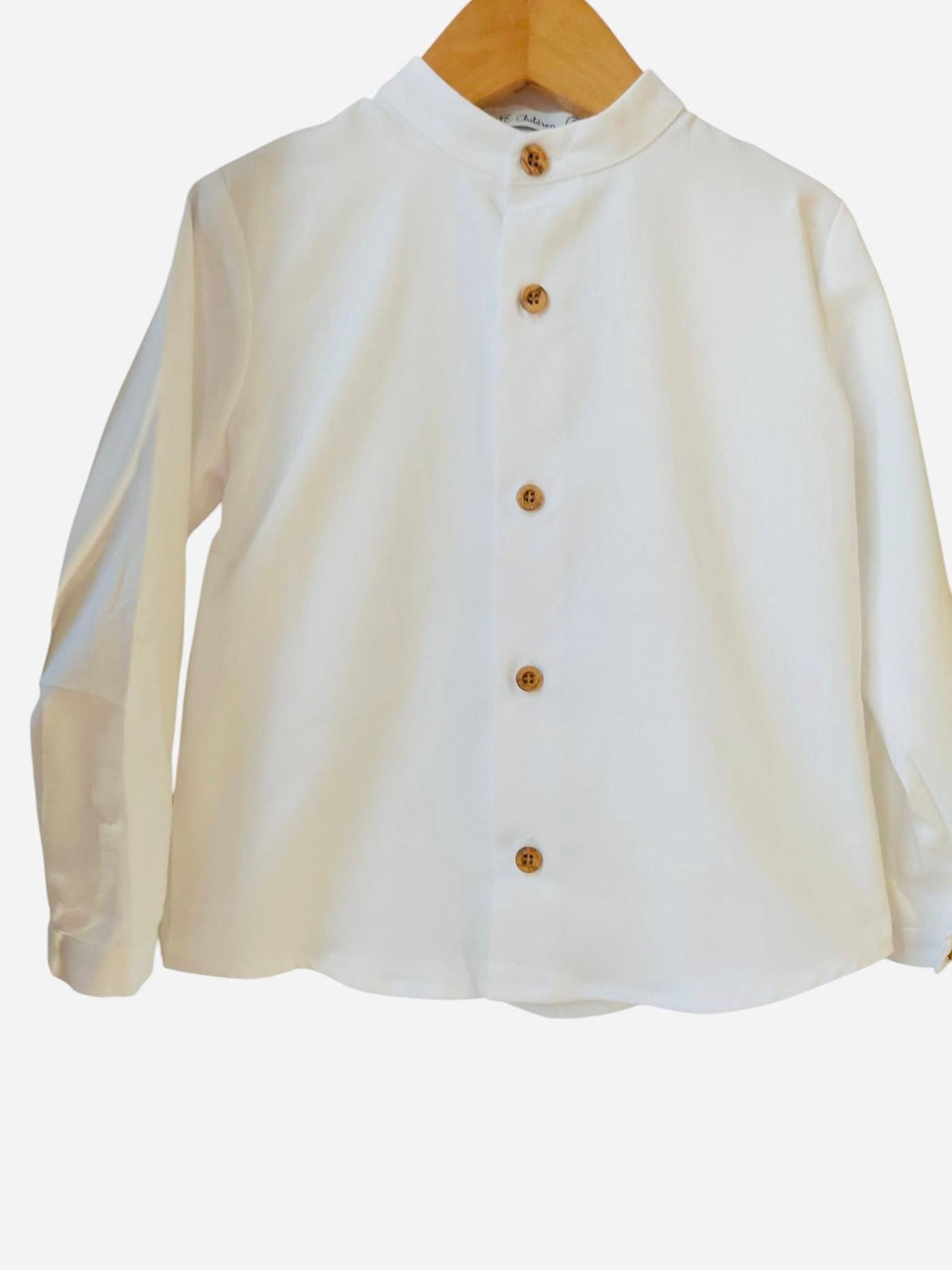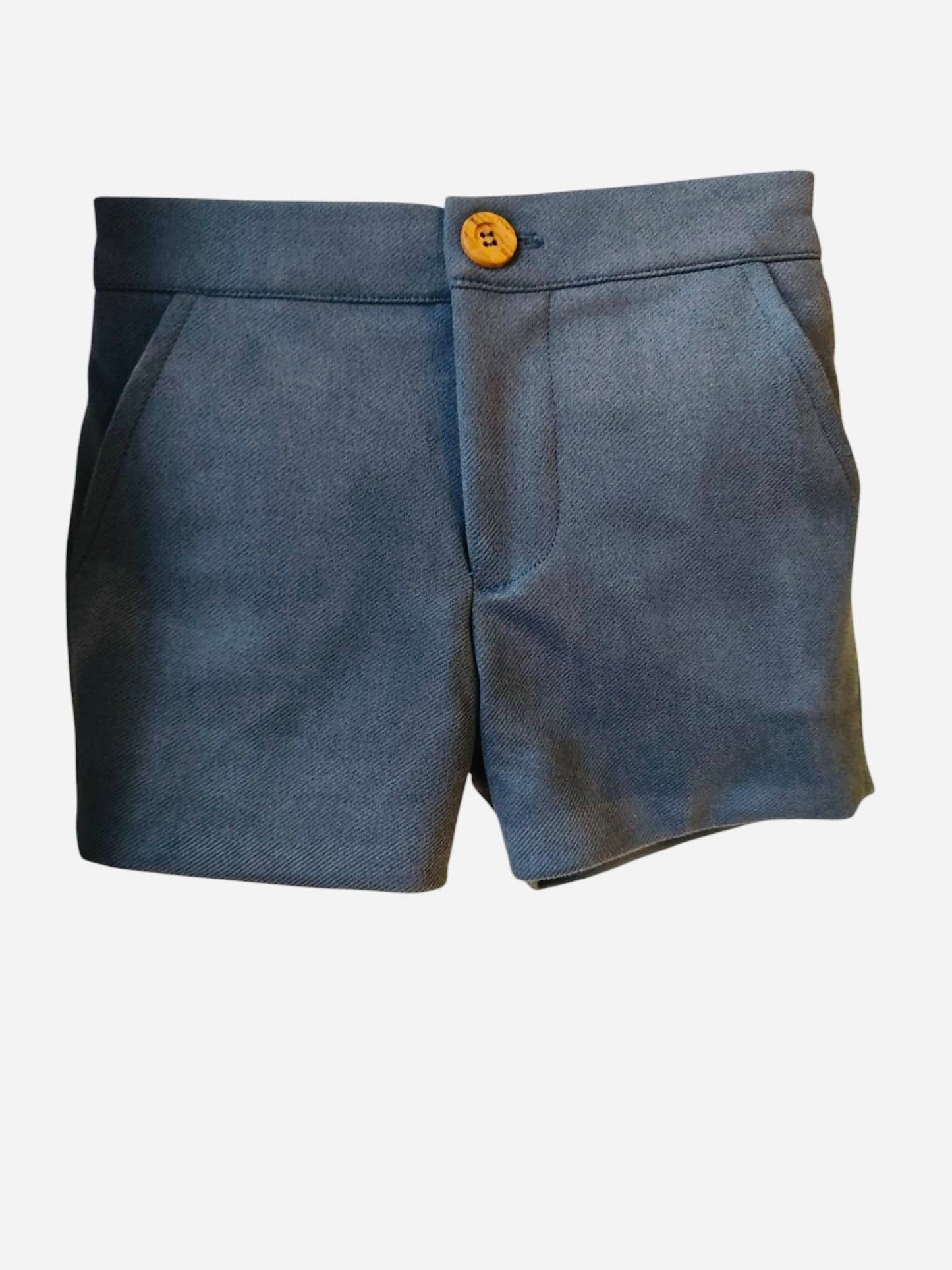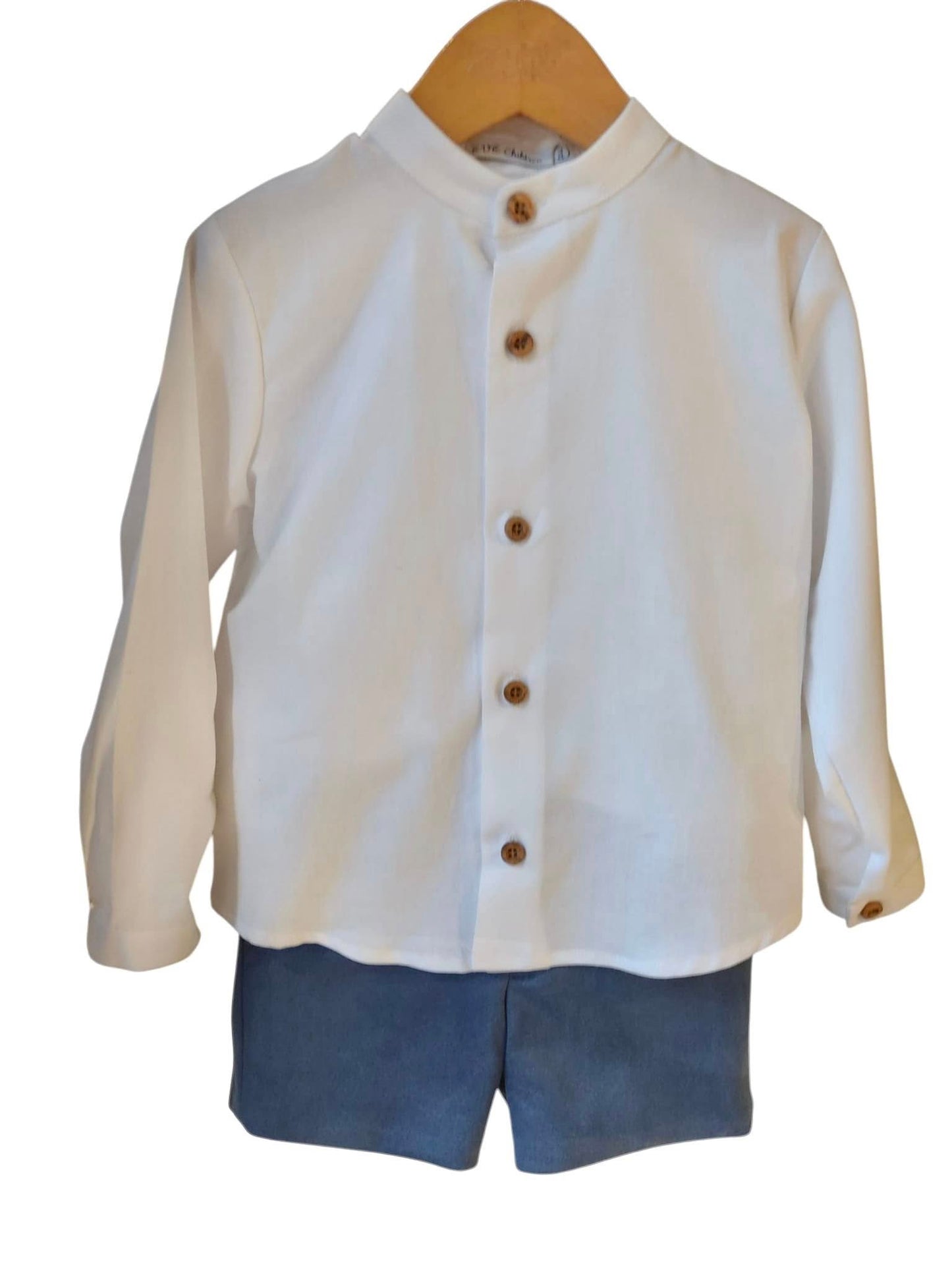 Conjunto de pantalón corto y camisa para niño de la marca española Eve Children. La camisa está confeccionada en una mezcla de algodón y lino blanco. Tiene cuello alto y se cierra con botones de madera. Los pantalones cortos están confeccionados en un tejido suave en un precioso tono azul índigo. Tienen cinturilla interior elástica, están completamente forrados y se cierran por delante con un botón de madera y cremallera. Un conjunto perfecto para un día especial de otoño/invierno.