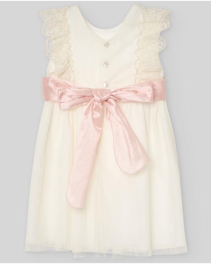 Vestido de tule com acabamento em renda e delicados babados nos ombros. Com corpete forrado e saia fluida com faixa rosa a formar um bonito laço nas costas. Oferece um estilo romântico e leve, ideal para cerimónias ou eventos especiais.