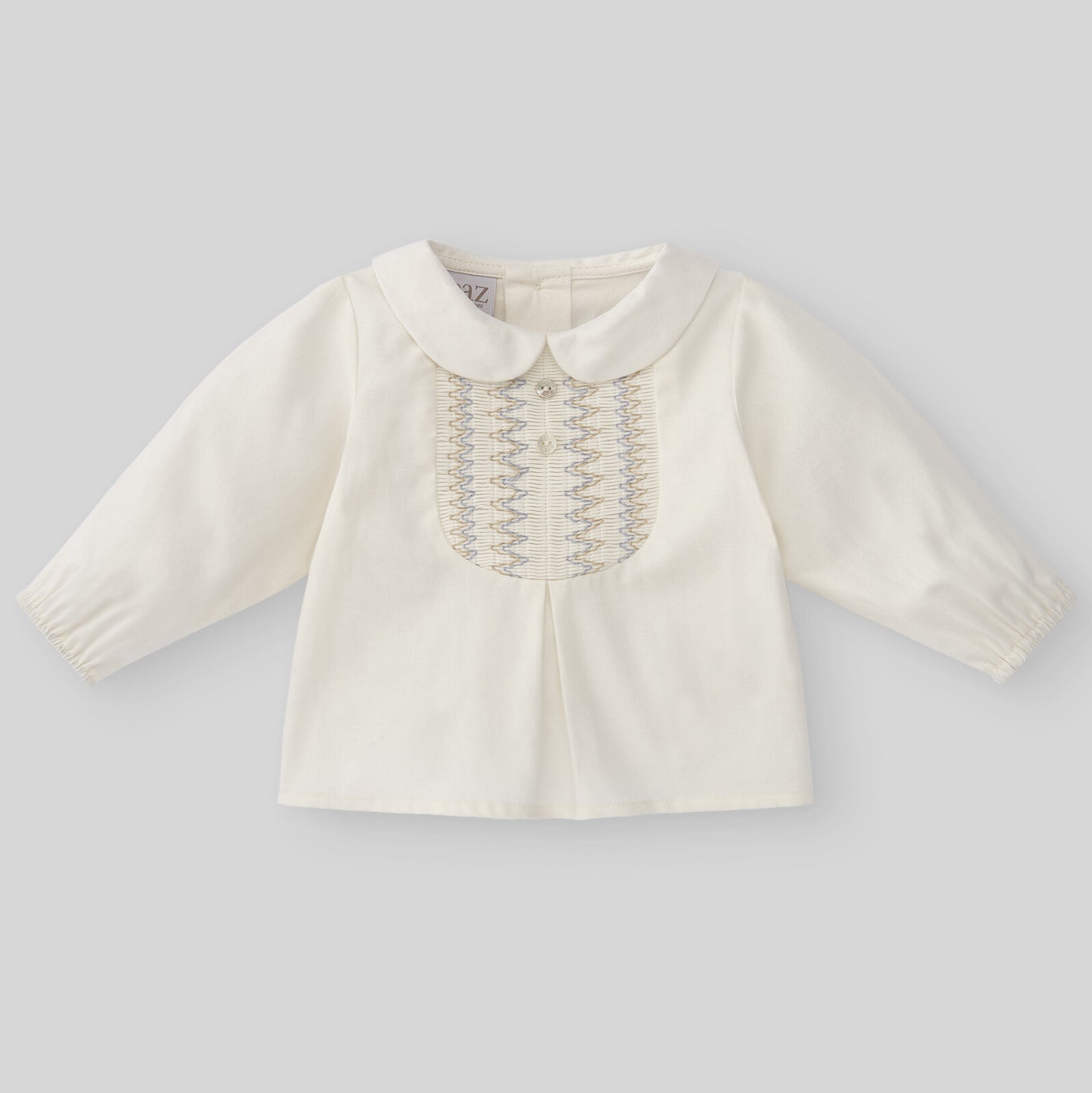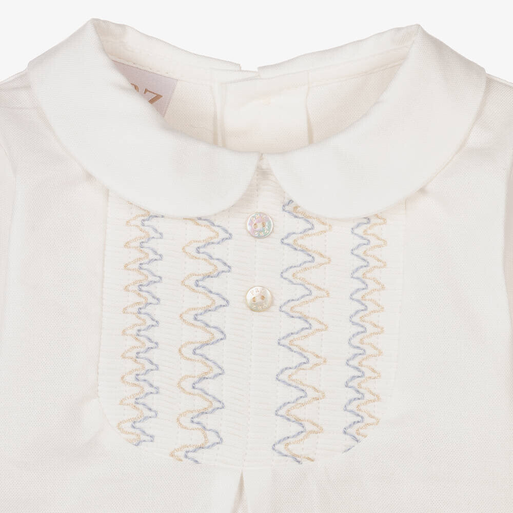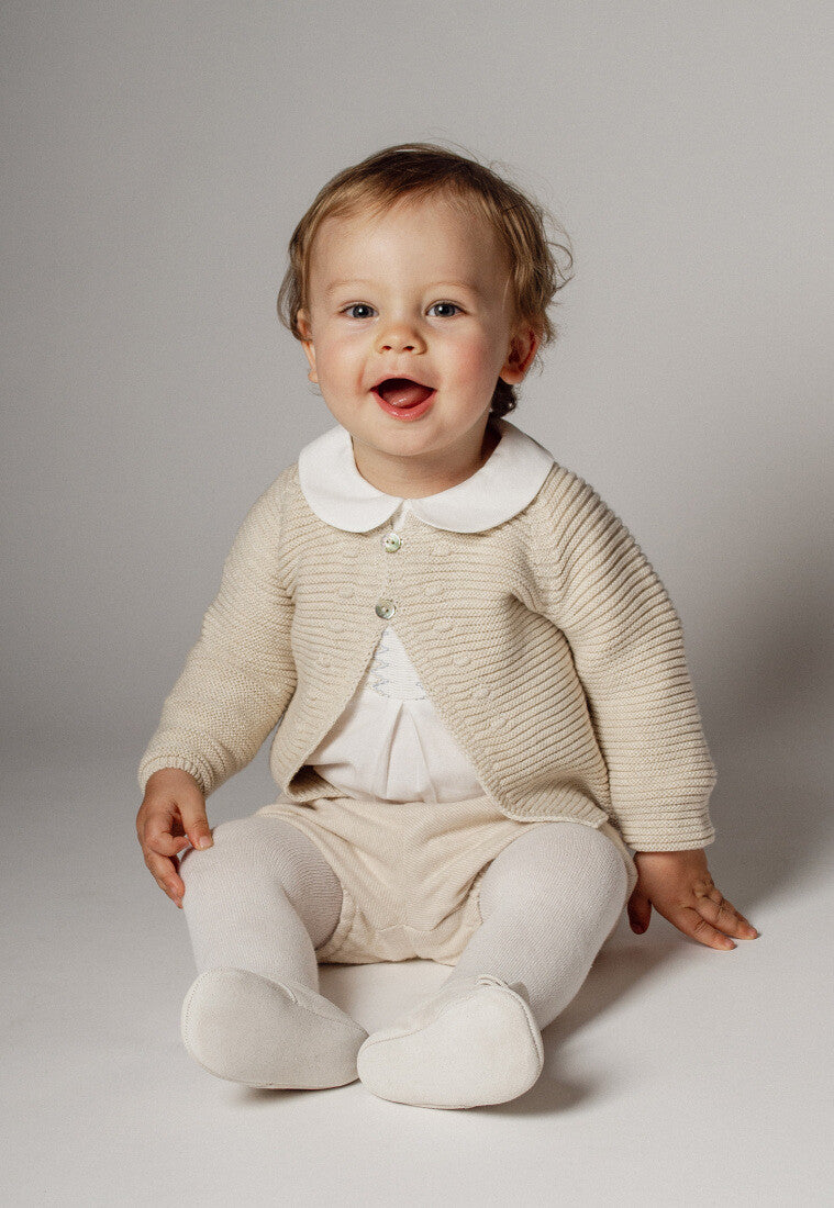 Elegante conjunto de camisa y pantalón corto beige para niño de la marca española Paz Rodríguez. La suave camisa de algodón en tono perla presenta cuello redondo, detalles de nido de abeja bicolor y botones decorativos de nácar para un look tradicional. Presenta un pliegue en la parte delantera y puños ligeramente elásticos.