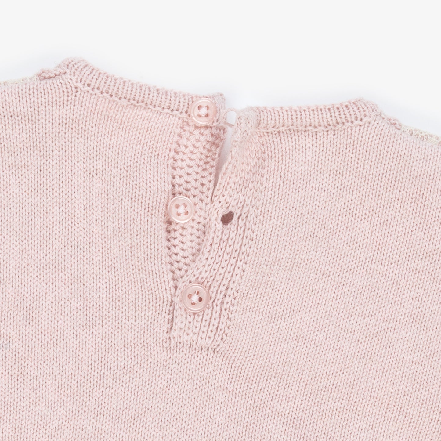 Este vestido rosa pálido para niña de PAZ Rodríguez está confeccionado en una suave mezcla de algodón y cachemira. La parte delantera estampada presenta un delicado ribete de encaje, rematado con un precioso lazo y un colgante con el logotipo de nácar. El dobladillo y los puños festoneados le aportan un toque de encanto, al igual que los botones de perla en la espalda.