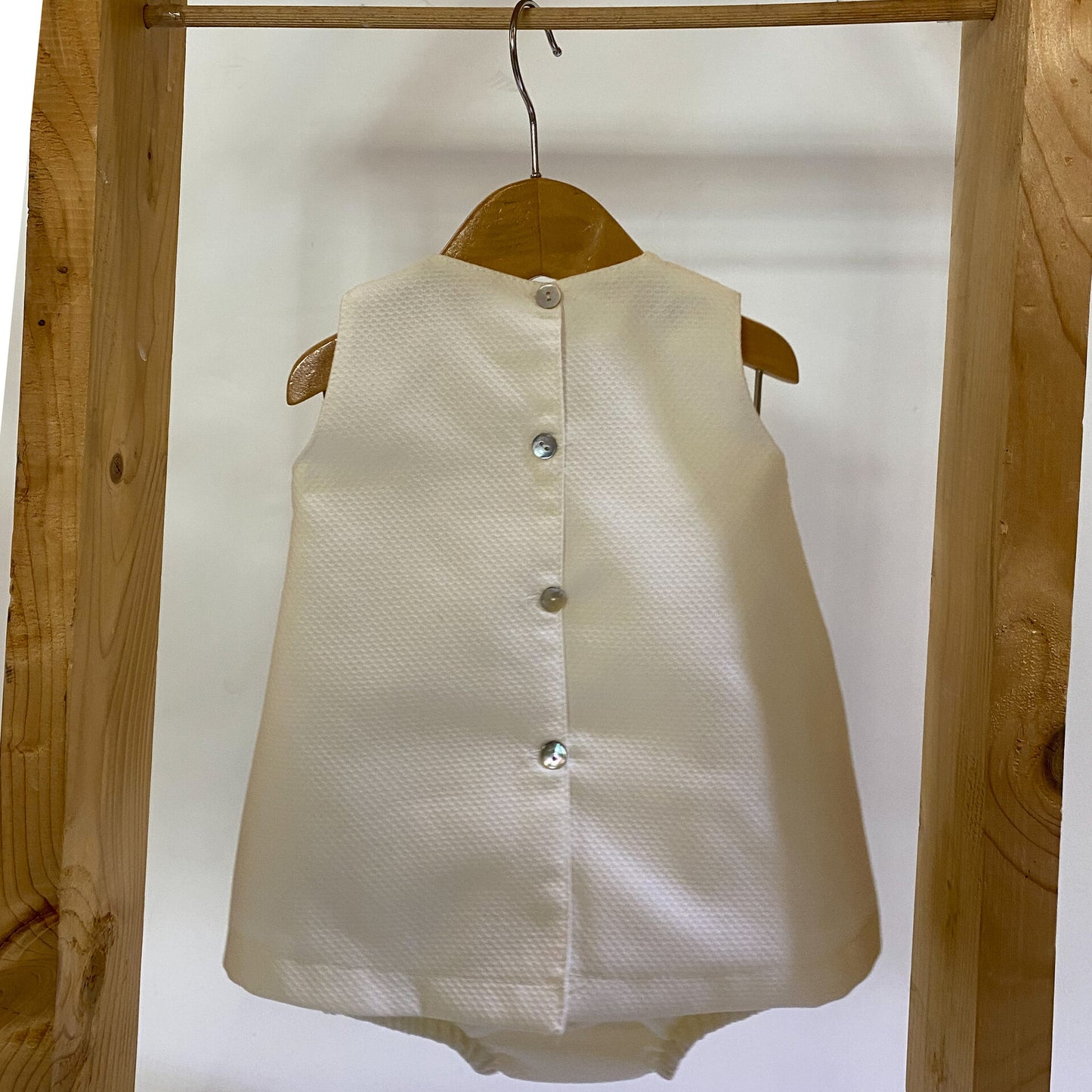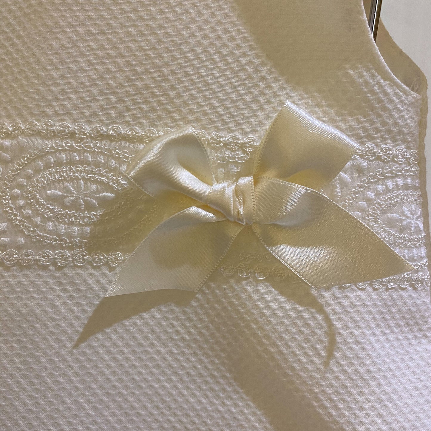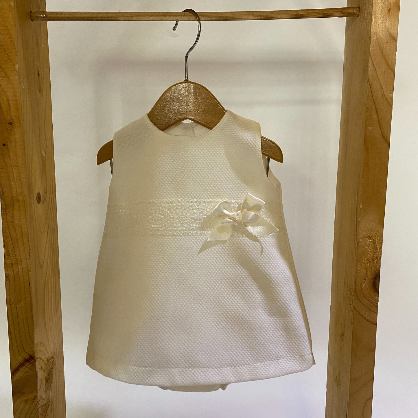 Vestido con cubrepañal en piqué perlado con aplicación de encaje y lazo de perla