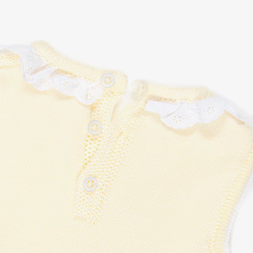 Um adorável fofo amarelo claro de algodão para bebés da Paz Rodríguez. Tricotado com delicadeza para o máximo conforto. Este modelo sem mangas possui gola de renda branca com babados e delicados detalhes em padrão de losangos na parte do peito, tem aplicado um bonito laço e um pingente com o logo da marca em madrepérola. Aperta com botões nas costas e entrepernas para facilitar a muda da fralda.