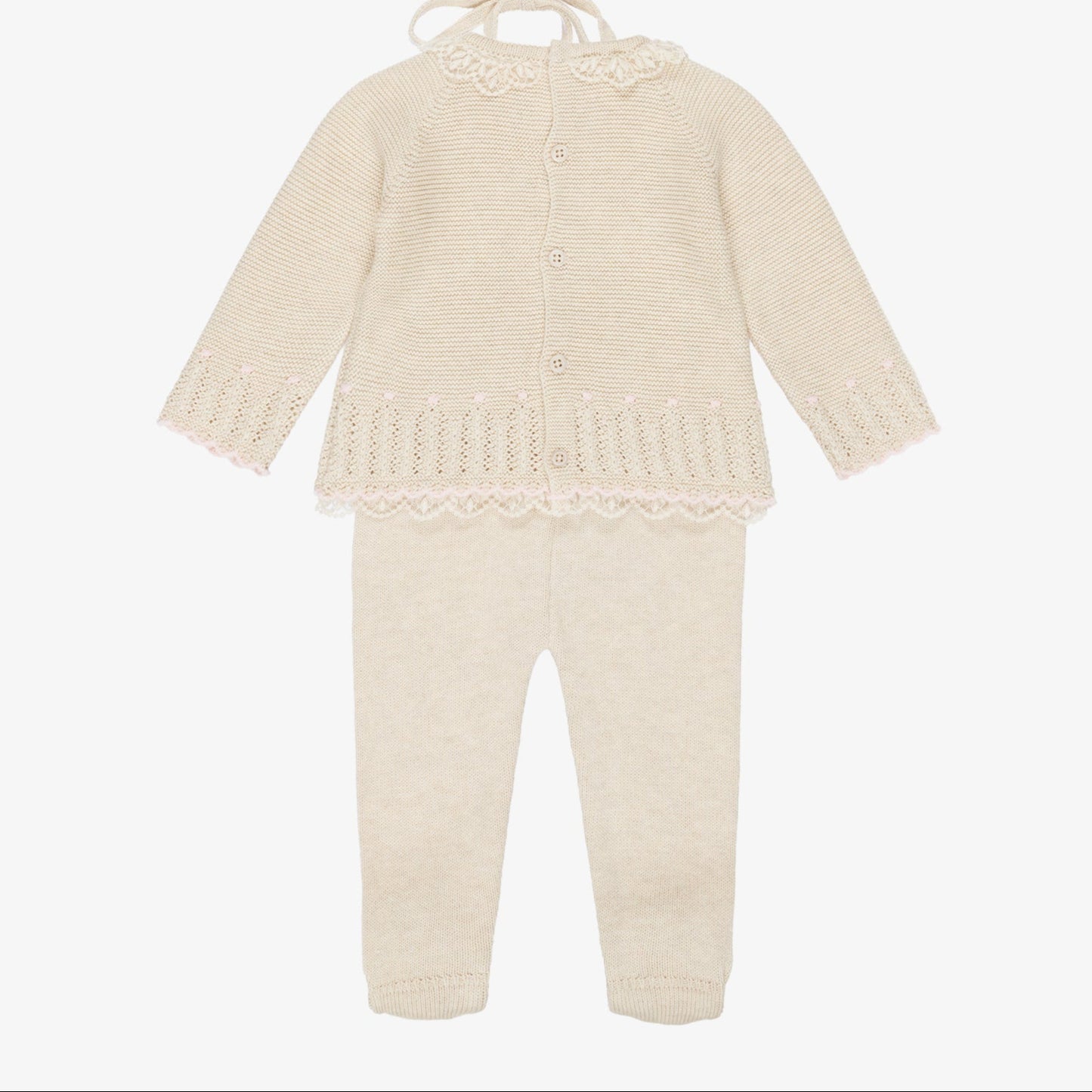 Conjunto de punto de algodón y cachemir beige y rosa “Alegría” de Paz Rodríguez