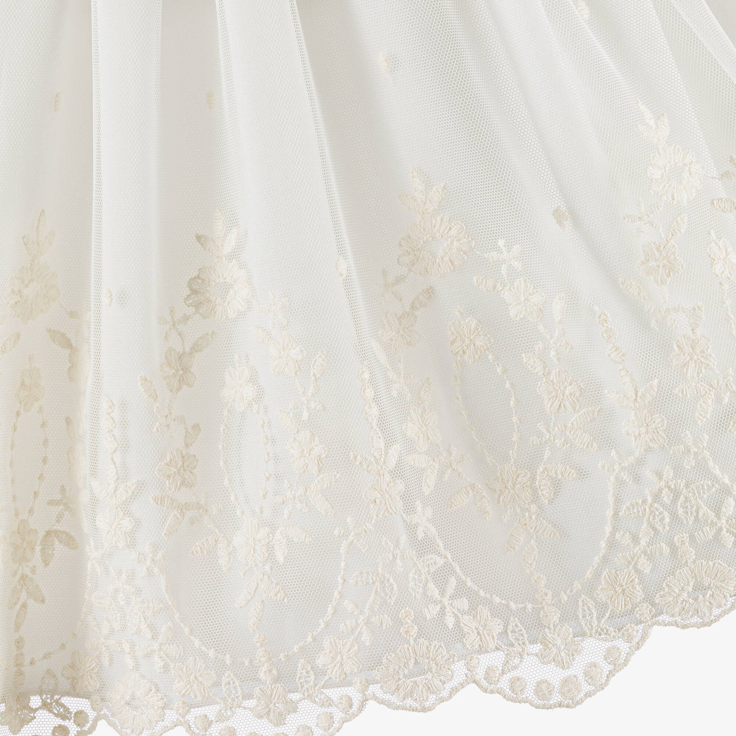 Este vestido de tule pérola para meninas da PAZ Rodríguez é deslumbrante para uma ocasião especial. O corpete sem mangas possui delicados detalhes em renda e botões perolados nas costas. A barra é bordada com flores delicadas e com acabamento ondulado para um toque de elegância. É totalmente forrado em algodão leve para maior conforto. Dando um lindo toque final, faixa em tule no mesmo tom forma um lindo laço nas costas.