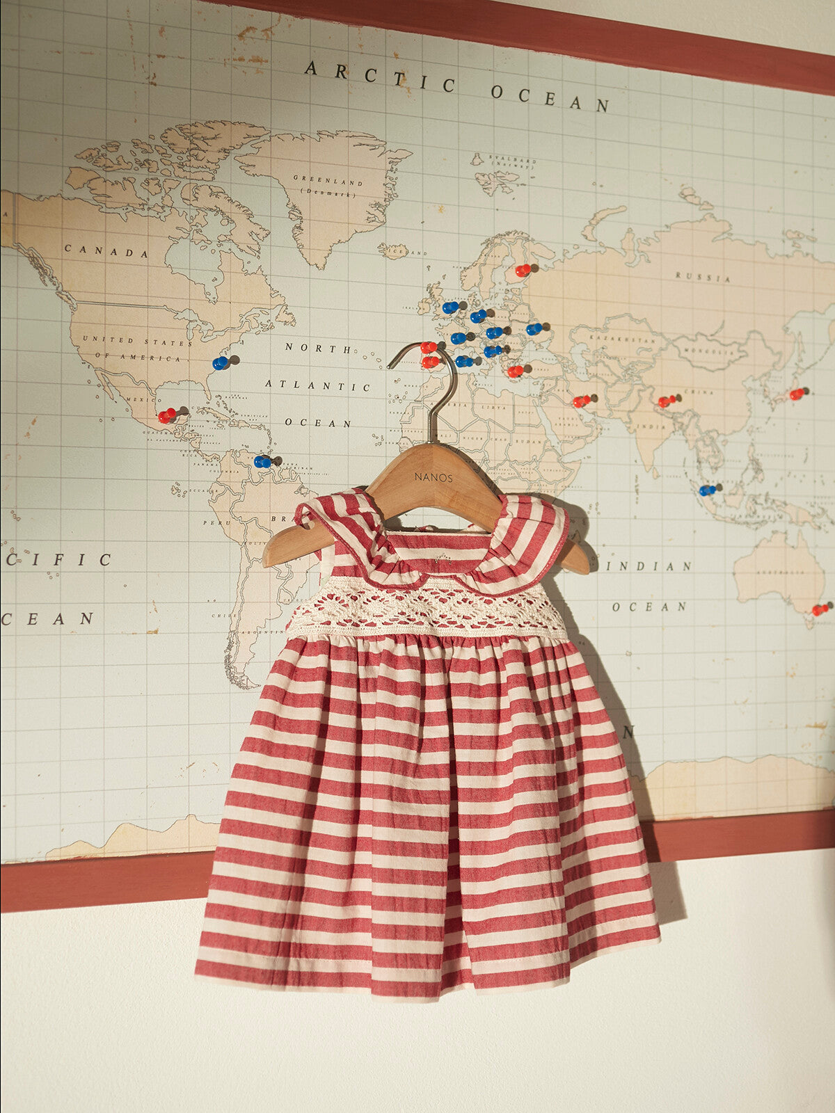 Vestido con braguita de rayas rojas y blancas, encaje en el pecho con el logo de NANOS diseñado con cristales en el pecho.