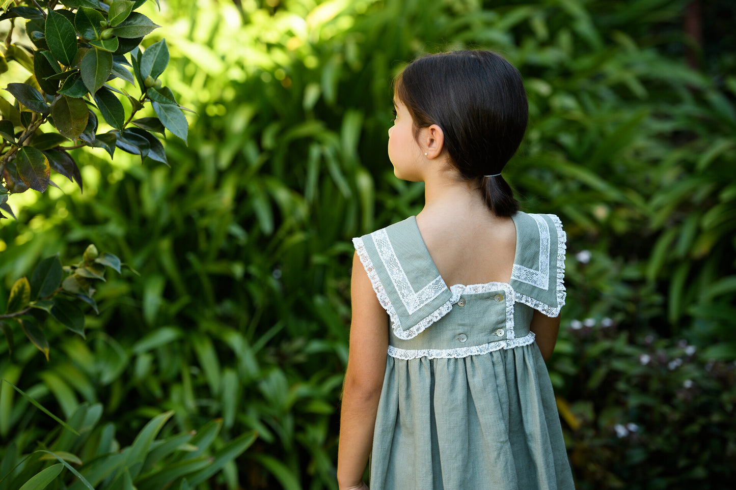 VESTIDO DE LINO VERDE CON ENCAJE DE PERLAS DE FOQUE