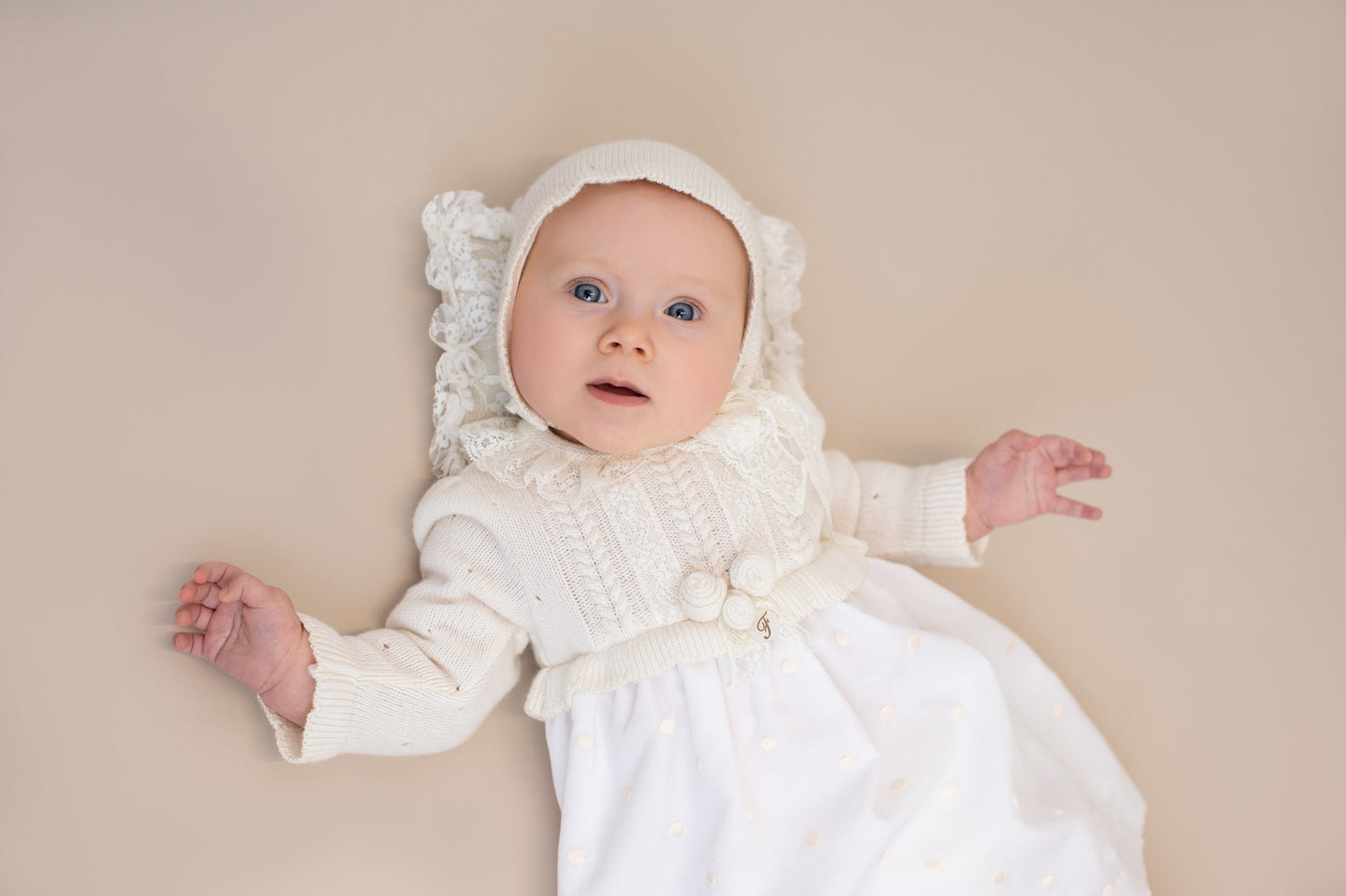 VESTIDO DE CEREMONIA FOQUE DE MANGA LARGA EN PERLA Y BLANCO