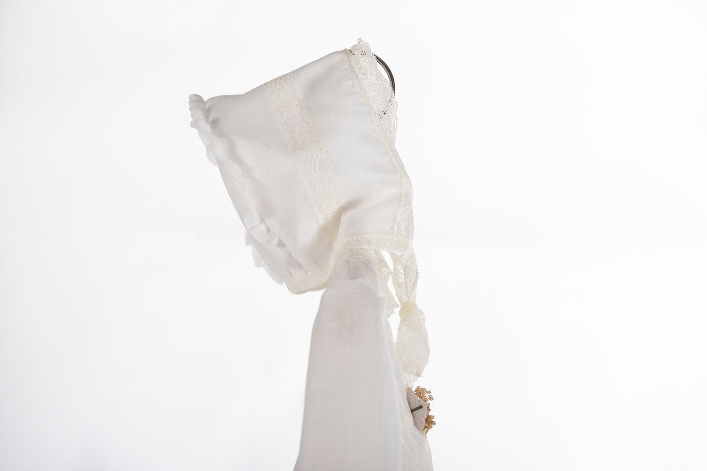 Vestido Niseret de organza color crudo y cubrepañal con gorro